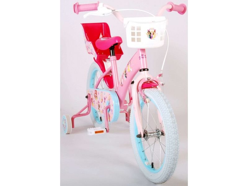 koleso 16 palcov, rám z ocele, oceľové ráfiky s nafukovacími plášťami, zadná protismerná brzda + predná čeľusťová (ručná) brzda, uzavretý kryt reťaze, balančné kolieska, sedačka pre bábiku, košík, vhodné pre deti od 4 do 6 rokov, veľkosť oblečenia 104 -110, z 85 % zostavené, oficiálna licencia Disney Princess, ružové Celý popis