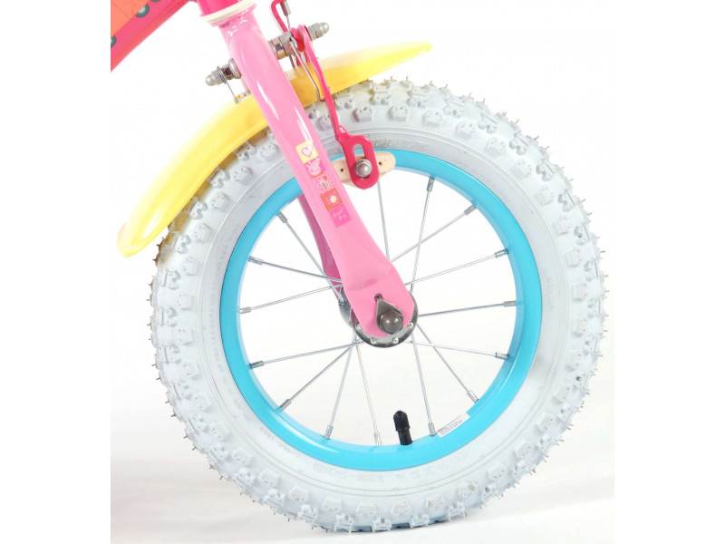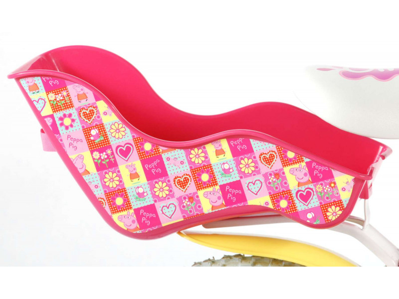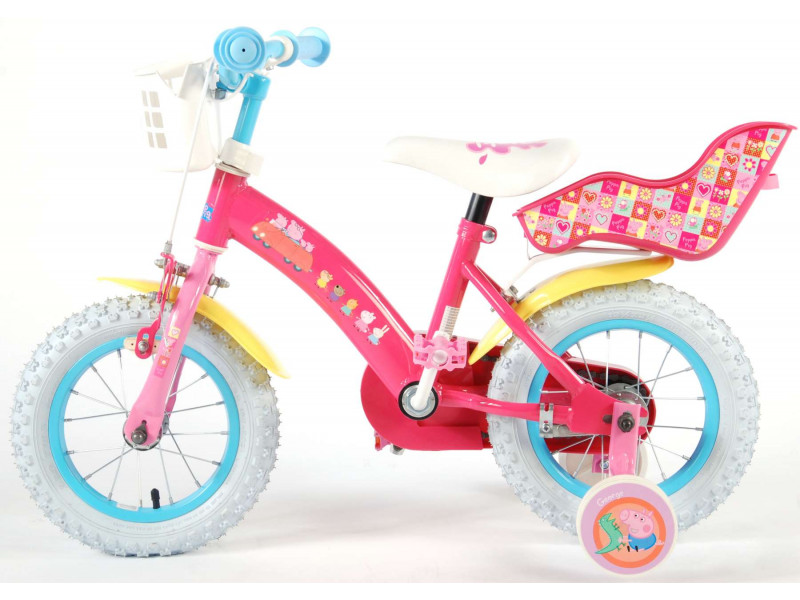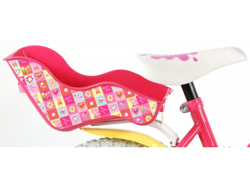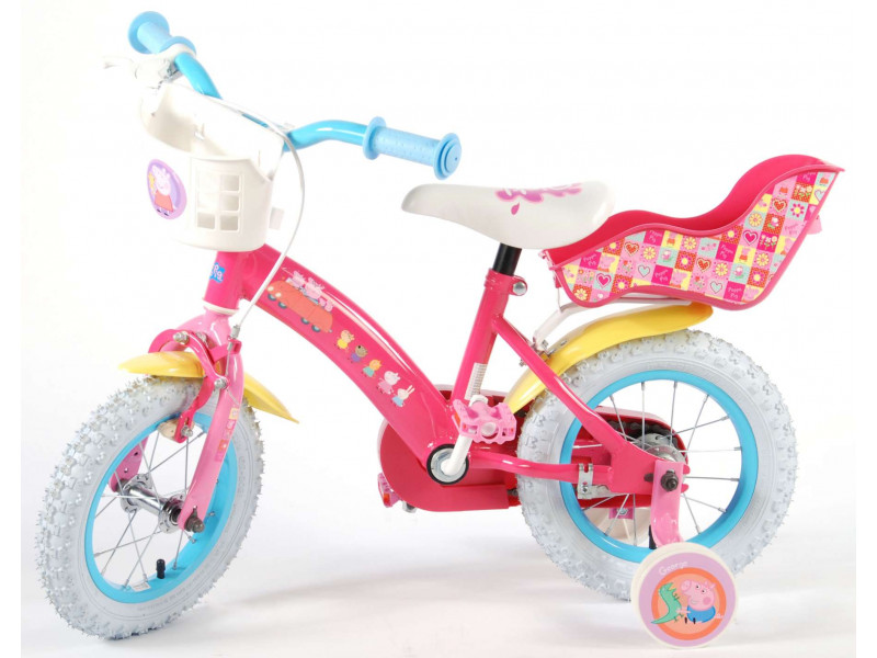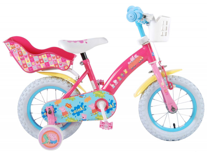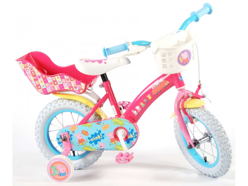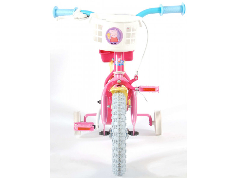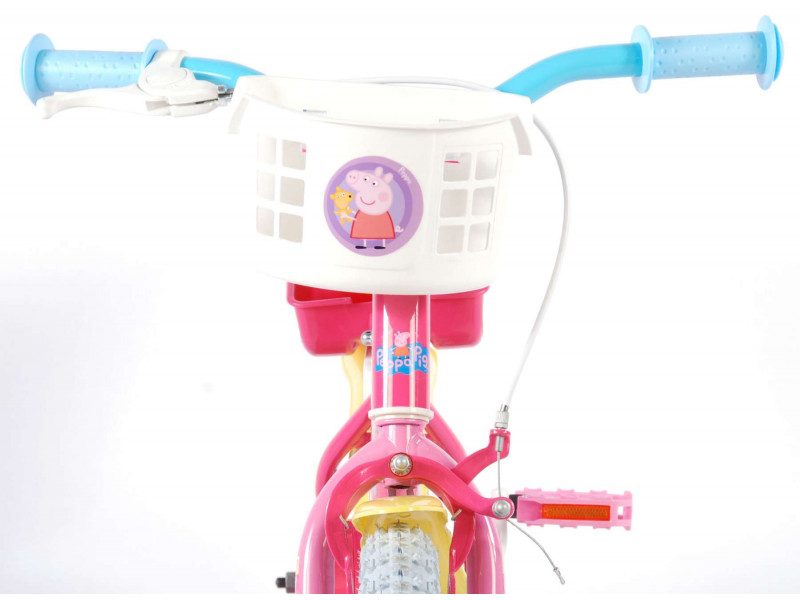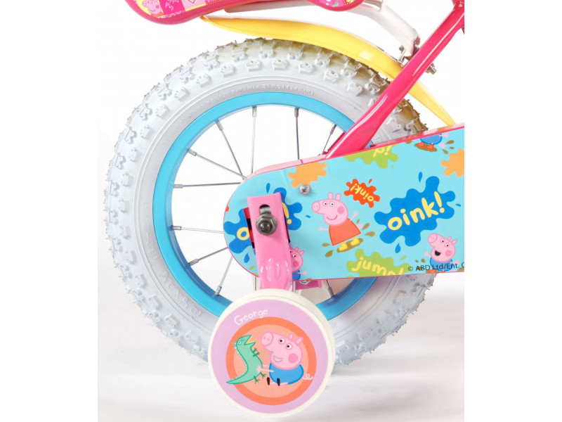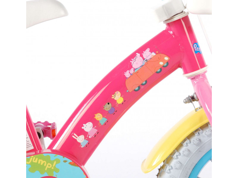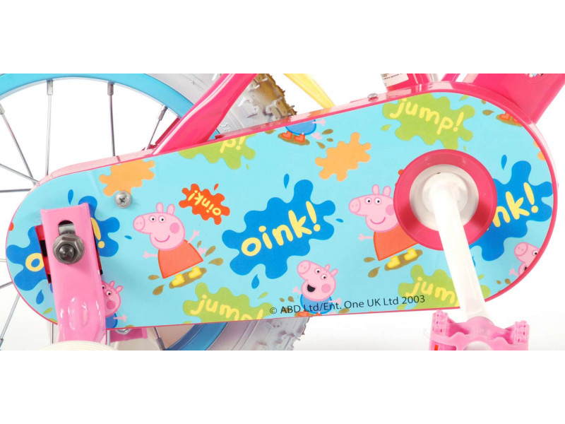 Máte doma malú fanúšičku prasiatka Peppy a zháňate pre ňu prvé kolo, na ktorom by sa naučila ľahko a bezpečne jazdiť? Potom vám garantujeme, že nový bicykel s motívom prasiatka Peppy bude gólom do čierneho. Bicykel je vybavený pevným rámom z ocele a 12-palcovými oceľovými ráfikmi. s nafukovacími plášťami. Nechýba ani sedačka pre bábiku a predný košík, ktorý cyklistka môže využiť na prepravu hračiek či nádoby na pitie. Bicykel disponuje nožnou protismernou brzdou v kombinácii s prednou čeľusťovou (ručnou) brzdou. Nemusíte tak mať vôbec obavy, že by dieťa nebolo schopné na bicykli dostatočne brzdiť. Používanie protismernej brzdy je pre dieťa najbezpečnejšie. Kombinácia nožnej a čeľusťovej brzdy ale dieťaťu navyše umožní postupne si zvyknúť na brzdenie ručnými brzdami , čo príde vhod pri neskoršom prechode na väčšie koleso. V začiatkoch dieťaťu pomôžu aj prídavné balančné kolieska. Vo výbave je ďalej uzavretý kryt reťaze, ktorý chráni dieťa pred kontaktom s reťazou a zároveň chráni samotnú reťaz pred poškodením. Dizajn spestrí rad roztomilých nálepiek a potlačí s motívom prasiatka Peppy. Bicykel je opatrený všetkými potrebnými bezpečnostnými certifikátmi.