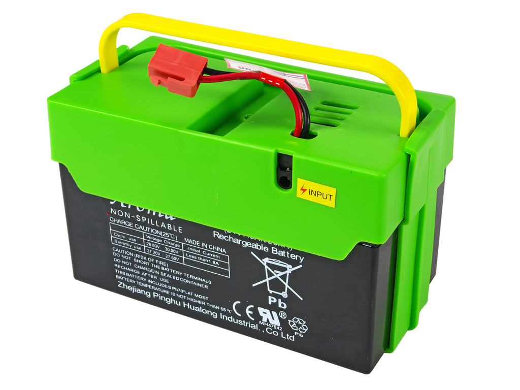 Súčasťou boxu je batéria 24V/7Ah , resetovacia poistka a nabíjacia zásuvka. Vďaka zabudovanej nabíjacej zásuvke je možné batériový box dobíjať mimo traktor .
