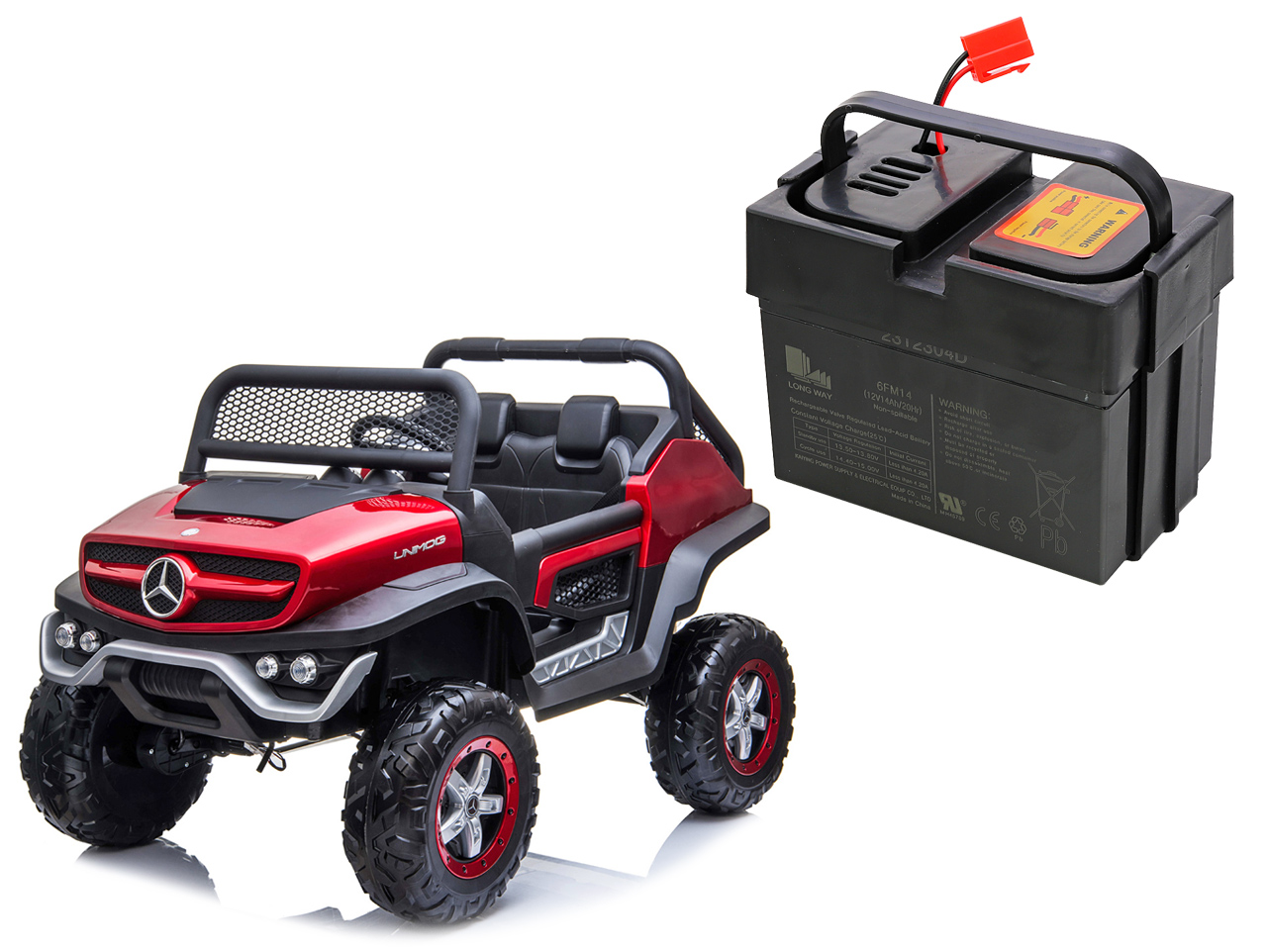 Náhradný batériový box je určený pre elektrické autíčko Mercedes-Benz Unimog . Batériový box je možné využiť na okamžitú výmenu batérie a zdvojnásobiť tak dojazd autíčka . Súčasťou boxu je batéria 12V/14Ah , resetovacia poistka a konektor pre pripojenie k autíčku.