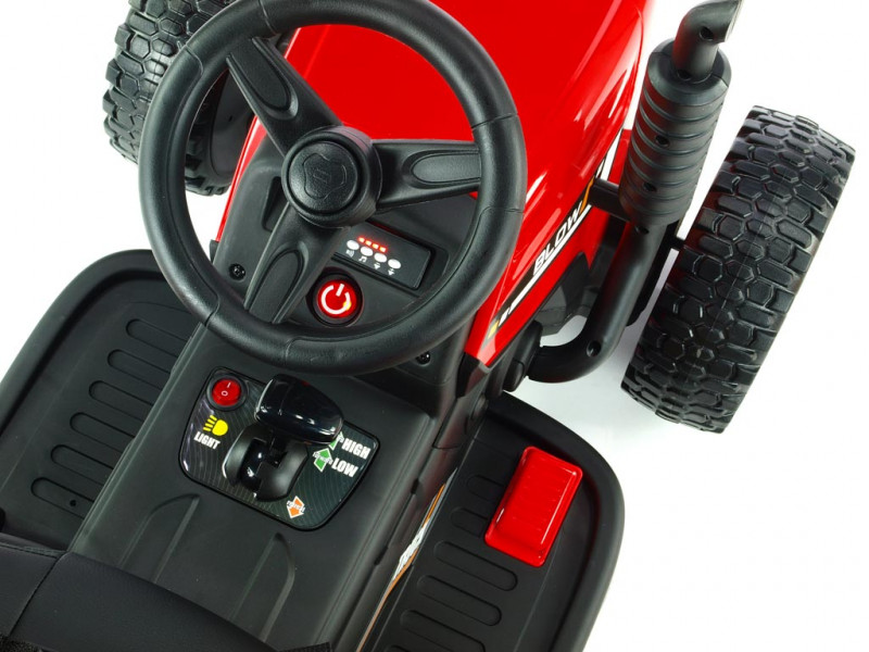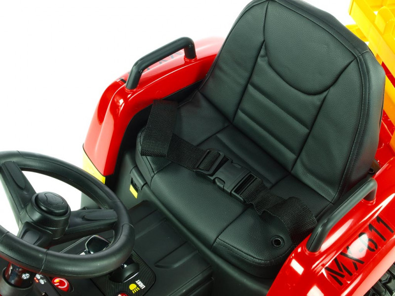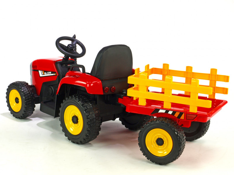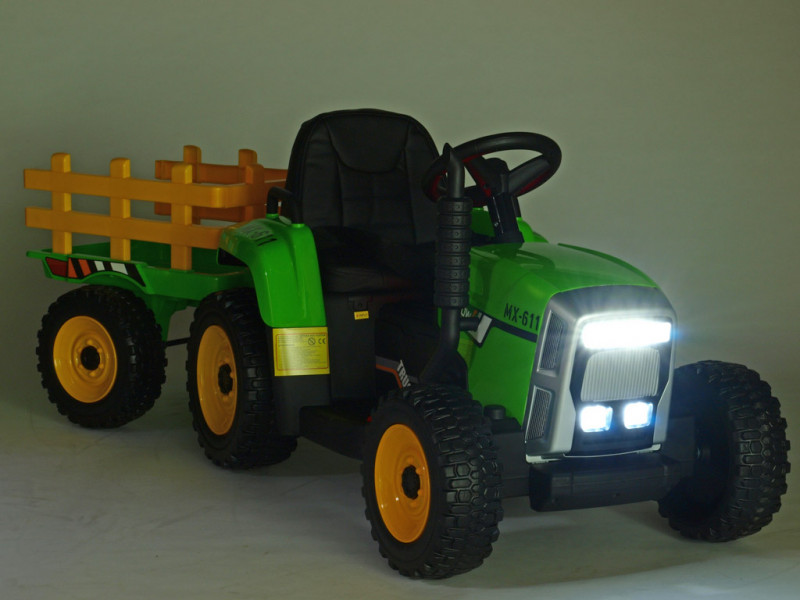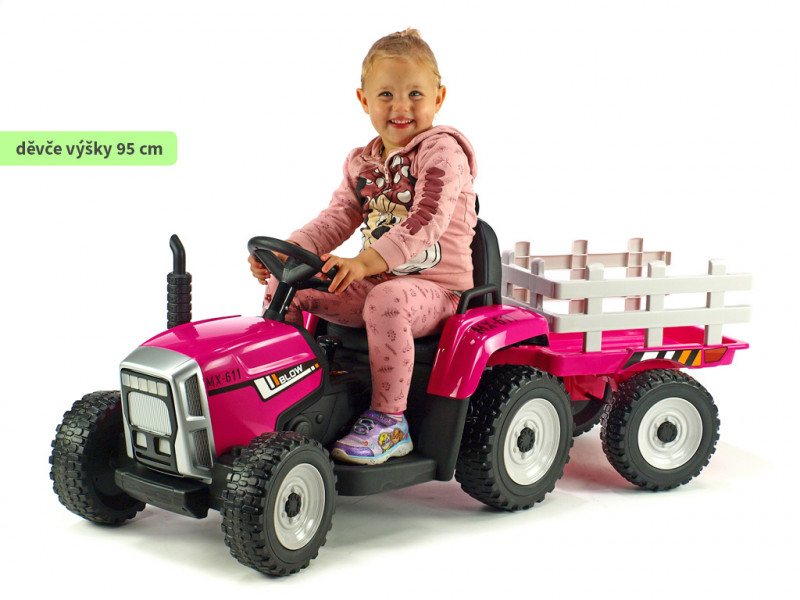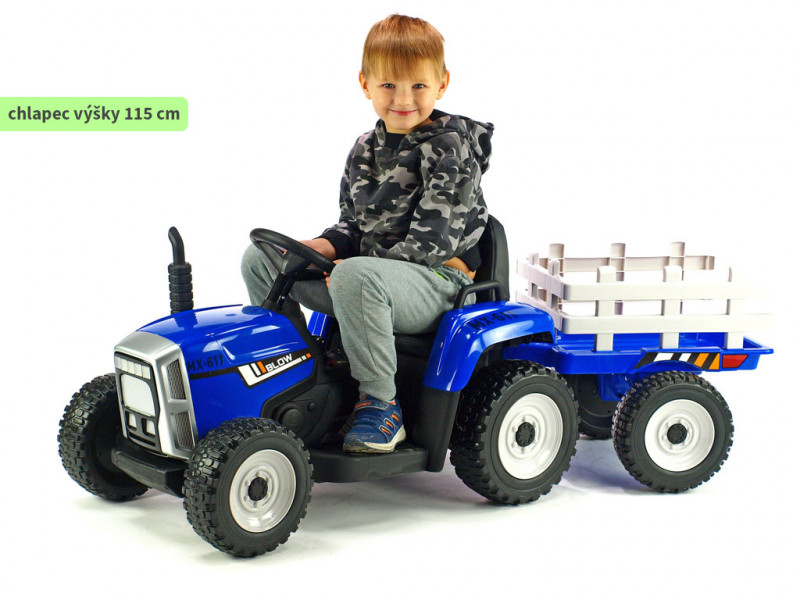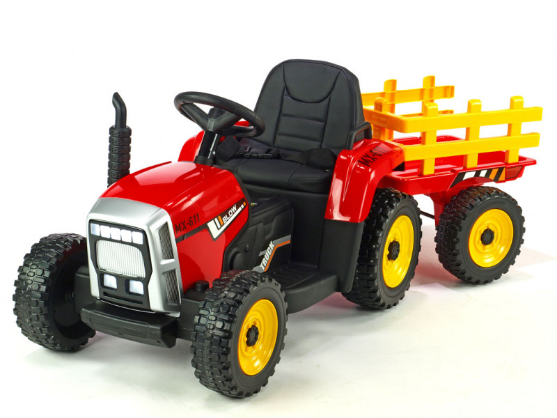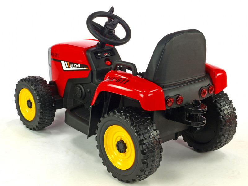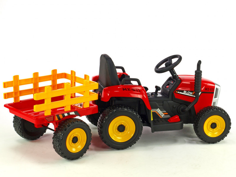 Traktorček Blow MX-611 je vybavený dvoma silnými motormi (2x 12V / 45W), ktoré poháňa obe zadné kolesá. Všetky kolesá sú vyrobené z tzv. EVA polyméru - pružného materiálu na báze gumy s vynikajúcimi tlmiacimi vlastnosťami. Jazda po tvrdom povrchu je v porovnaní s plastovými kolesami značne príjemnejšia. K pohodliu prispeje aj príjemná čalúnená sedačka, ktorá je opatrená bezpečnostným pásom. Pod volantom sa nachádza tlačidlo pre zapnutie/vypnutie predných LED svetiel, hudobný prehrávač a LED indikátor stavu batérie. Vo volante je zabudovaný vzduchový klaksón. Deti k svojmu traktoru dostanú aj prípojný vlek, na ktorom môžu prevážať náklad do 5 kg.
