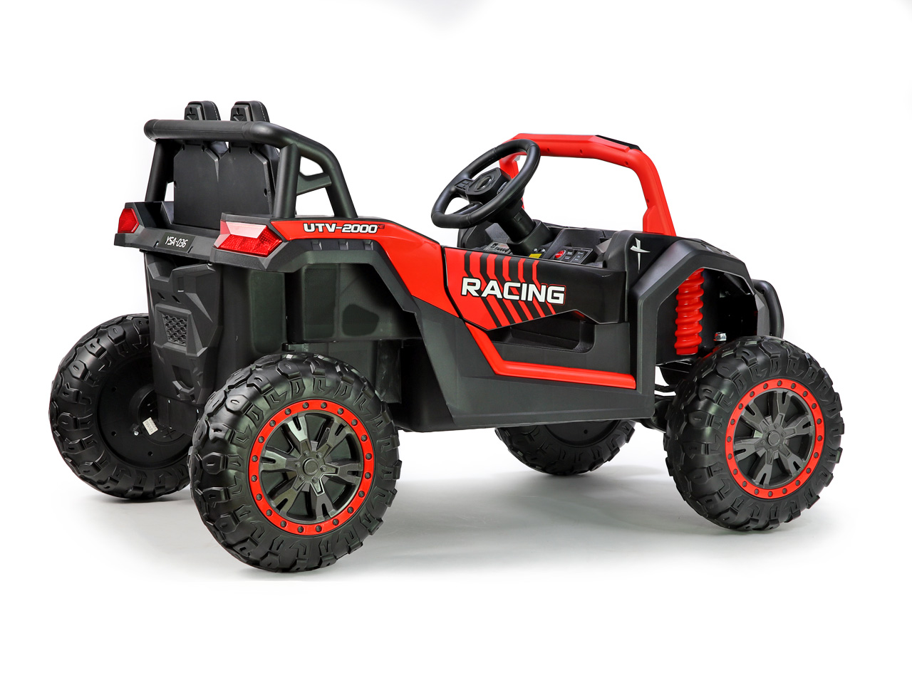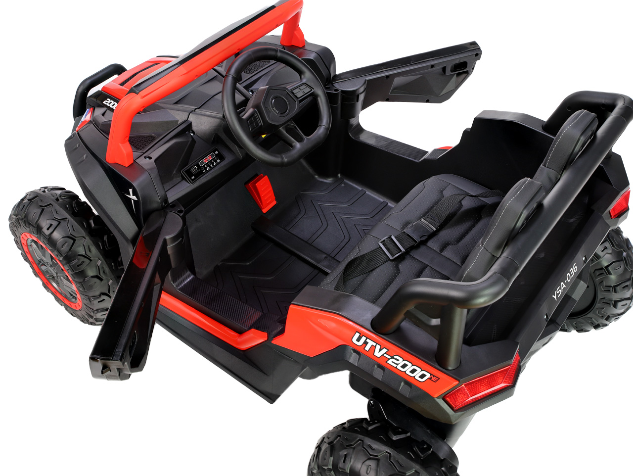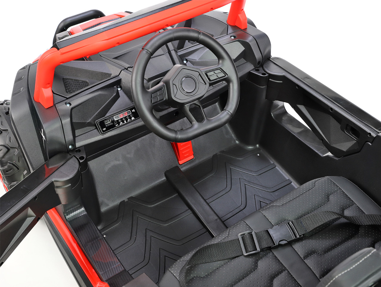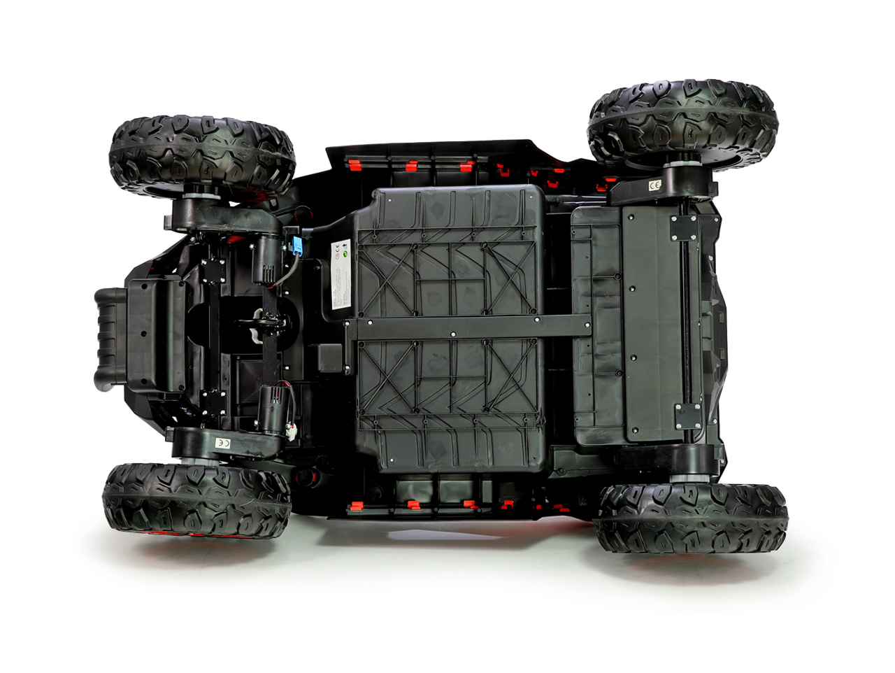4 motory 12V/35W, batéria 12V/10Ah, 2.4G diaľkové ovládanie, 2 rýchlosti na manuál / 3 na diaľkové ovládanie, plynulý rozjazd, Bluetooth, USB, SD, AUX, EVA kolesá, polstrovaná sedačka z eko kože, odpruženie zadnej nápravy, predné LED svetlá, zvukové efekty, ukazovateľ stavu batérie, otvárateľné dvere Celý popis