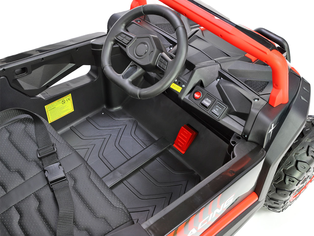 Nasadnúť, pripútať a šliapnuť na pedál! Stlačením pedála sa bugina plynulo rozbehne , uvoľnením pedála sama zabrzdí. Na palubnej doske sa nachádza prepínač rýchlosti jazdy, takže vodič môže voliť medzi dvoma rýchlosťami . Na diaľkovom ovládaní sa ponúkajú rýchlosti celkom tri.
