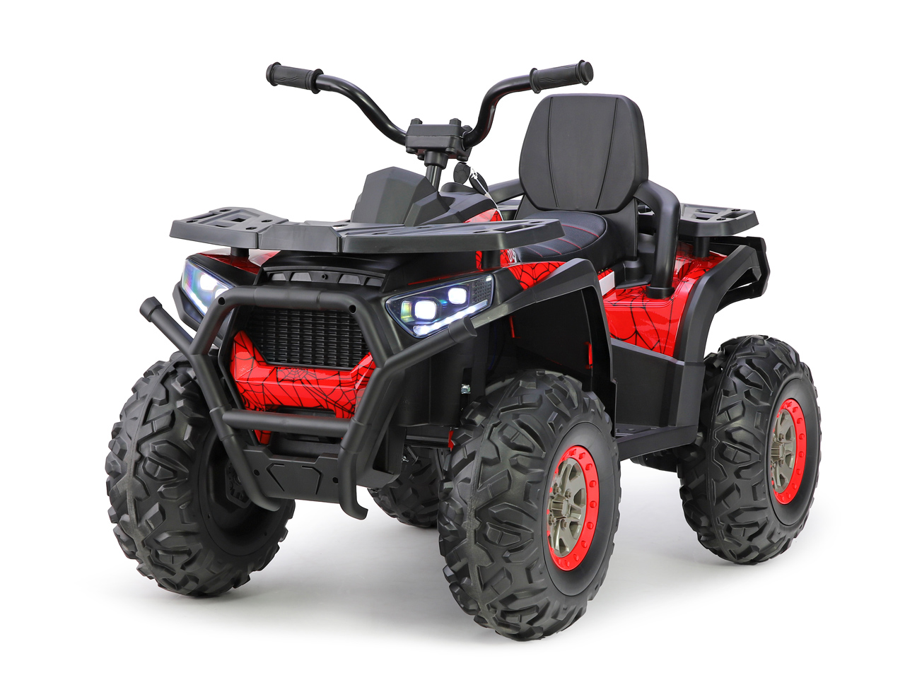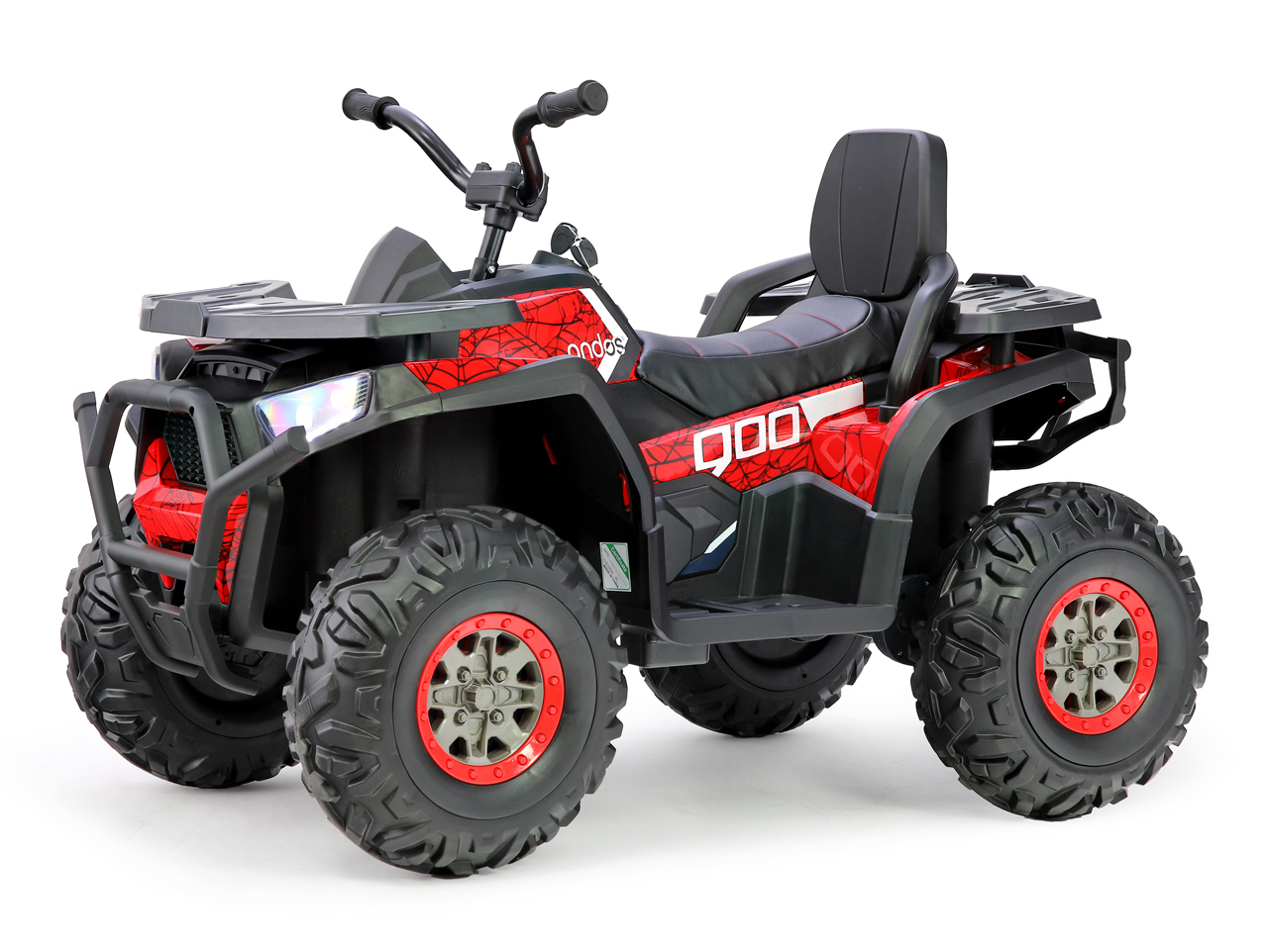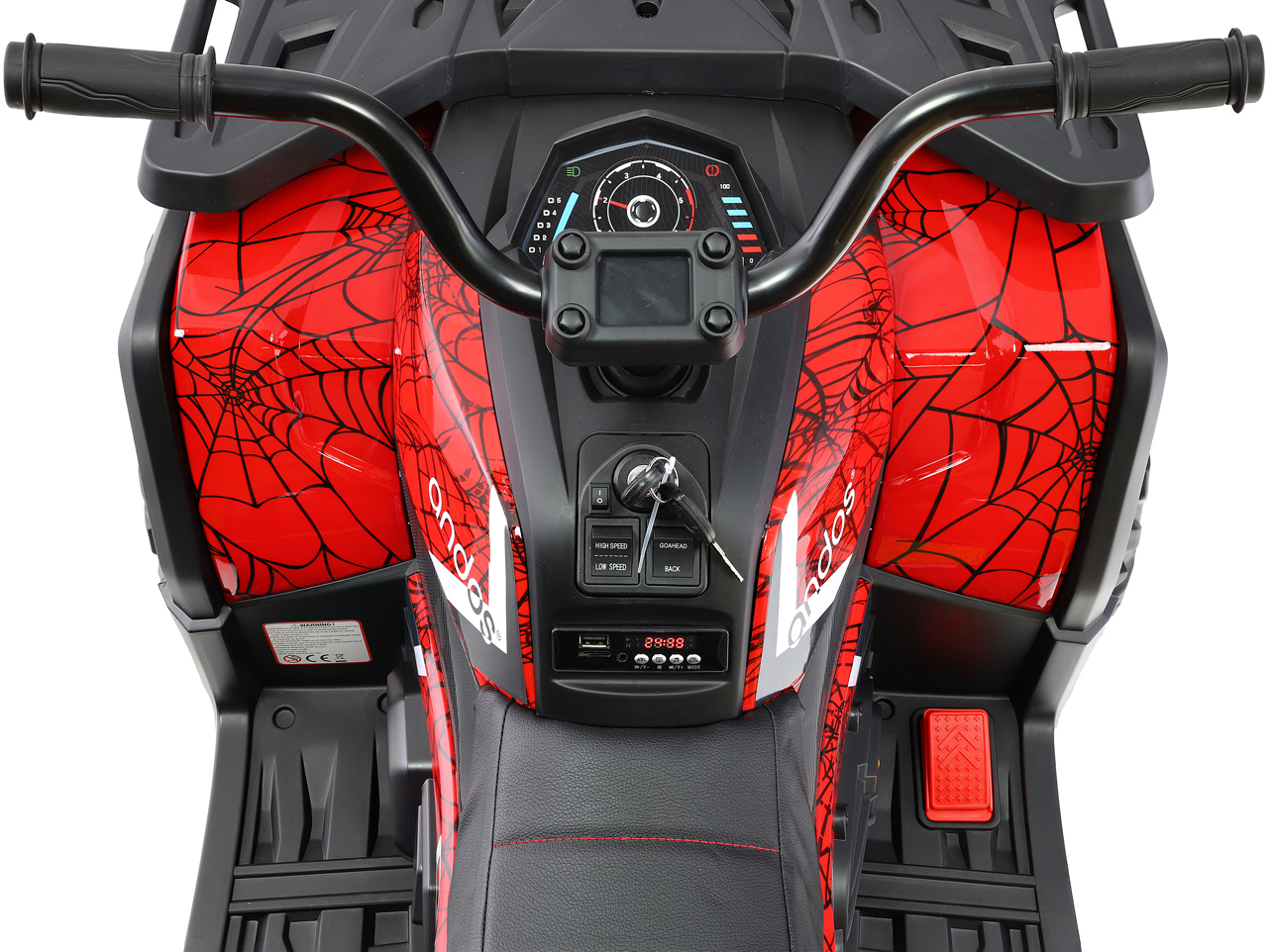 2 motory 24V/200W, 2 batérie 12V/7Ah spojené do 24V/7Ah, 2 rýchlosti na manuál / 3 na diaľkové ovládanie, rýchlosť až 8 km/h, nosnosť 50 kg, plynulý rozjazd, polstrovaná sedačka, EVA kolesá, odpruženie zadnej nápravy, predné a zadné rádio, ukazovateľ stavu batérie, štartovacie klíčky, lesklá povrchová úprava spider, opierka chrbta pre maximálnu bezpečnosť
