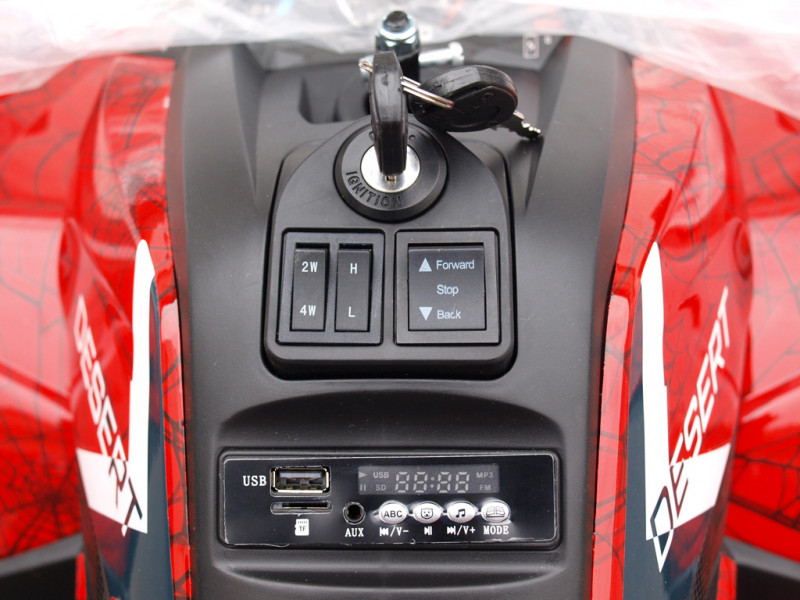 Jazdu spestria zvuky štartovania a burácania motora. Počas jazdy si deti môžu zapnúť aj hudobný prehrávač. Ten síce obsahuje niekoľko vopred nahraných pesničiek, avšak tá pravá zábava sa, samozrejme, začína až pri počúvania vlastnej muziky. Na to môžete použiť vstup AUX (3,5 mm jack pre kábel), USB alebo SD kartu. Pesničky nahrajte napríklad na flashku a tú zapojte do štvorkolky. Po spustení začne hudba znieť z reproduktorov. Hlasitosť zvukov je možné ovládať tlačidlami pri prehrávači, takže sa nemusíte vôbec báť, že by štvorkolka bola príliš hlučná.