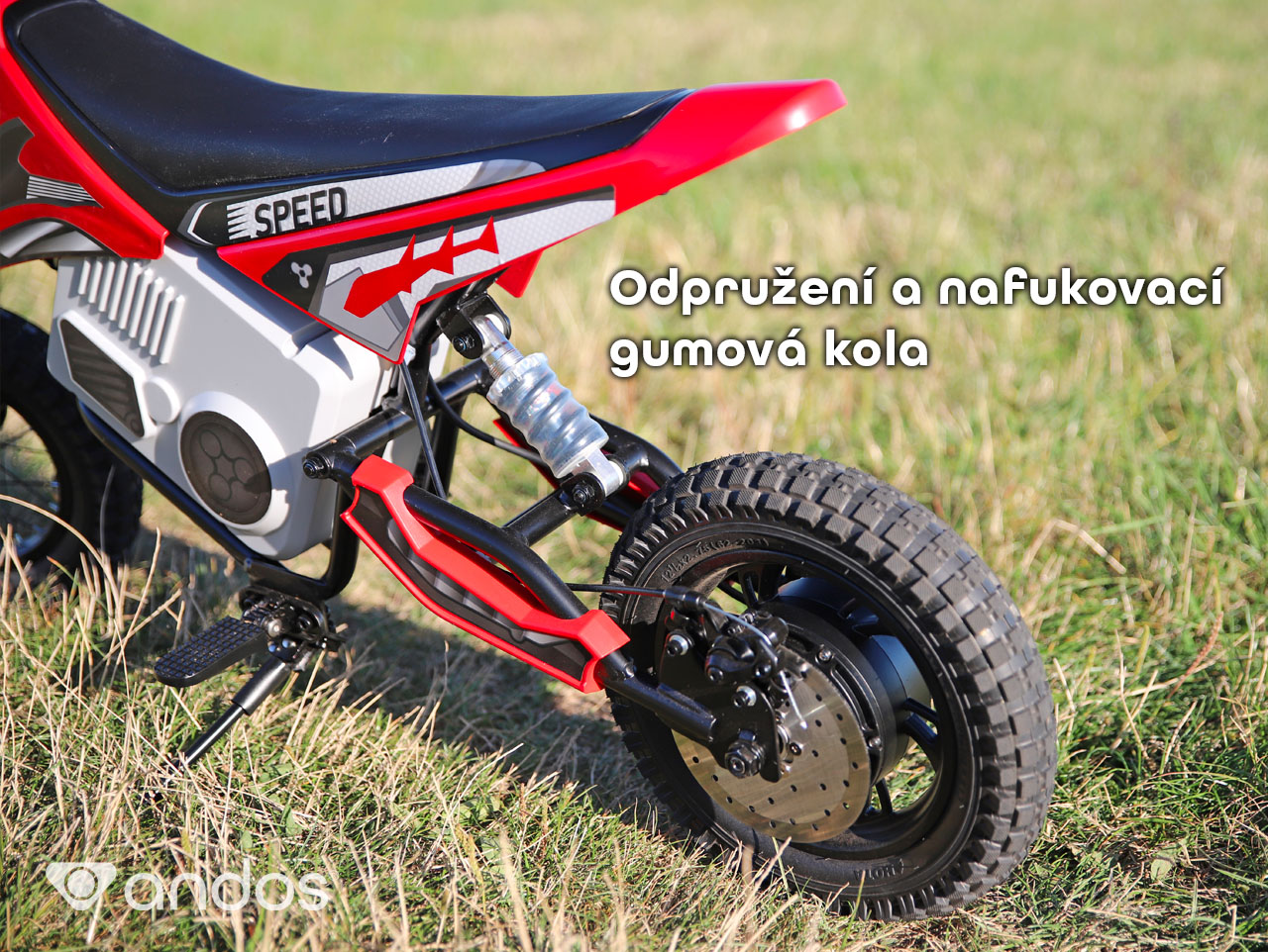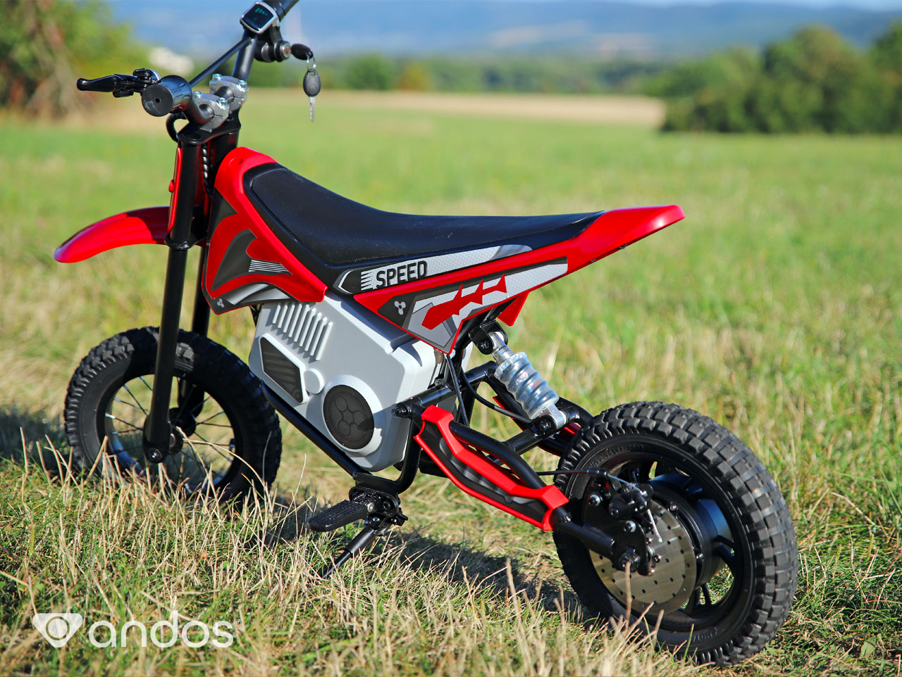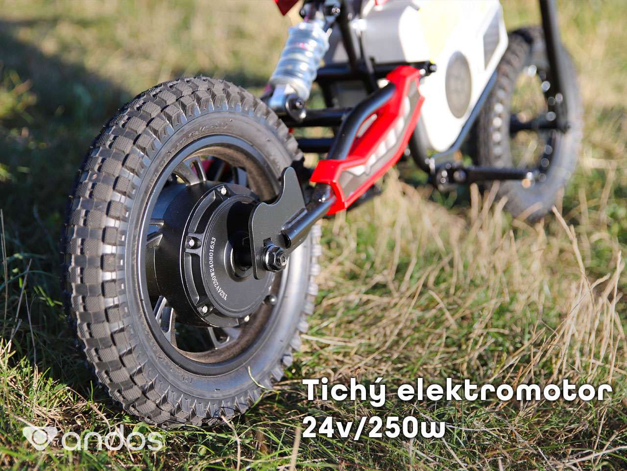 Detskú motorku andos Rebel poháňa bezkefový elektromotor 24V/250W, ktorý to dokáže vytiahnuť až na 15 km/h. Vďaka bezkefovej technológii je motor výrazne tichší ako bežné motory v elektrických (alebo benzínových) vozidlách, takže si deti užijú jazdu naplno bez toho, aby rušili okolie.
