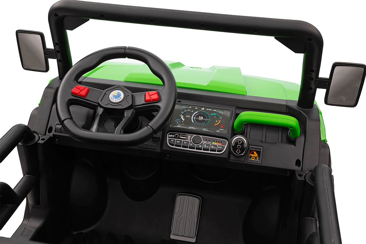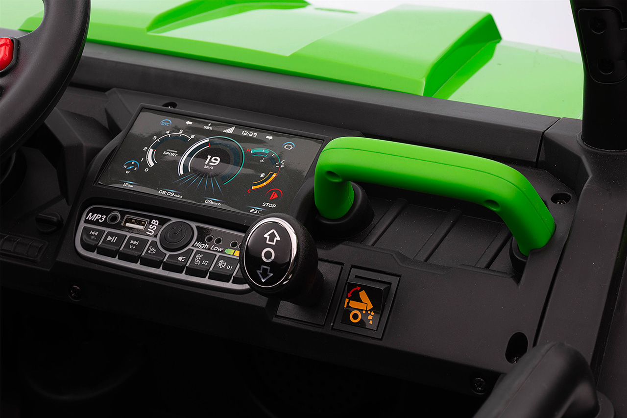 Konektivita a efektivita dnešnému automobilovému priemyslu vládnu a Texas Farmer nezostáva pozadu. Autentická prístrojová doska hostí ovládací panel so všetkými prvkami prehľadne na jednom mieste . Tlačidlo stop/štart, páka pre zaradenie spiatočky, zapnutie svetiel alebo sklápanie korby , pre každú funkciu jedno tlačidlo. Aby cesta alebo práca rýchlejšie ubiehala, môžete pripojiť vlastný USB disk či mobil pomocou AUX aleboBluetooth a počúvať, čo detské srdce poteší. Na volante sa nachádza klaksón a prepínanie predpripravených pesničiek. A aby vám nepraskla hlava a veveričky vydesene neprchali, hlasitosť zvukov je možné regulovať .