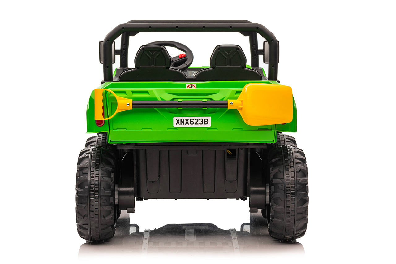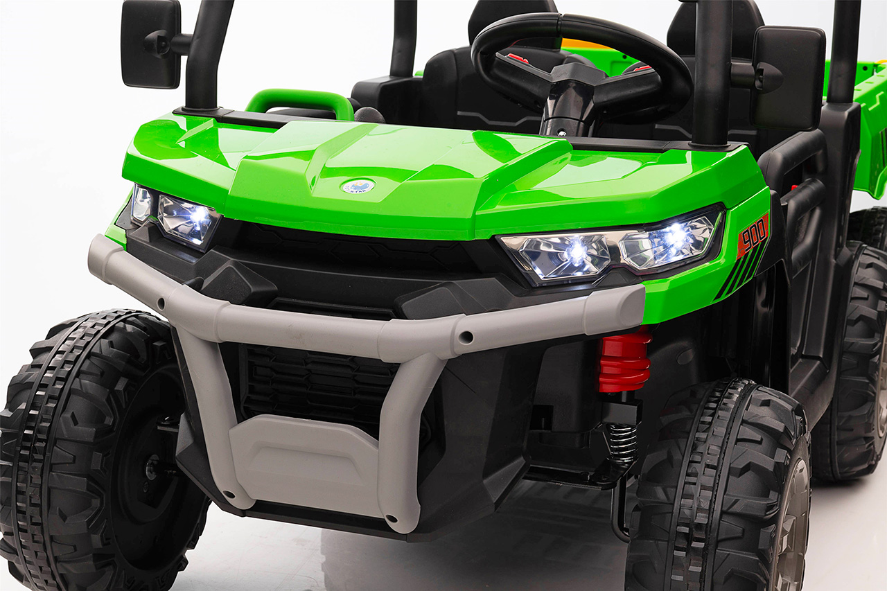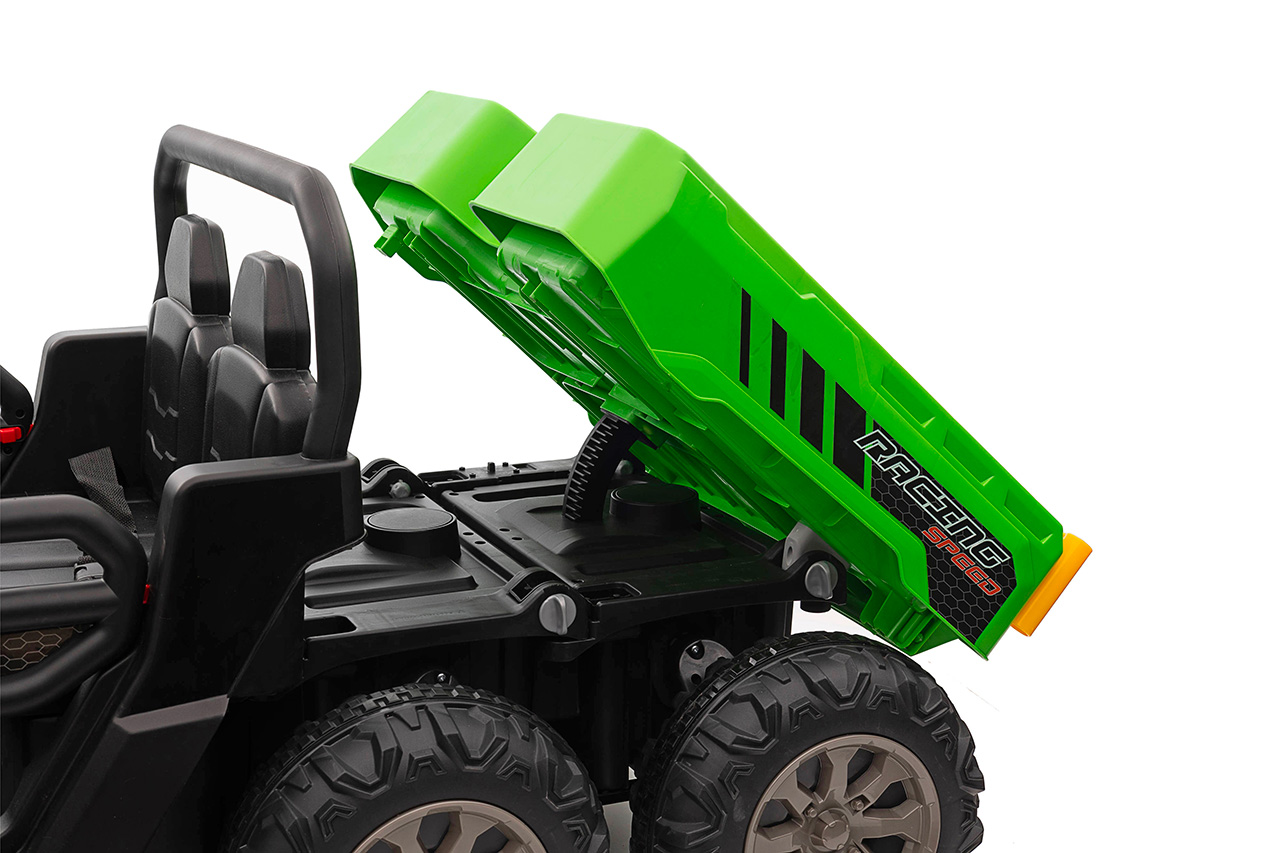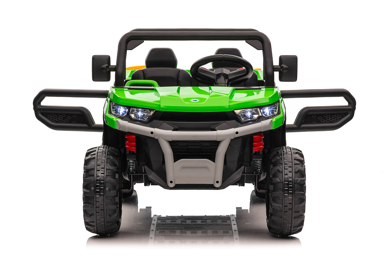 4 motory 24V/120W, prenosný box s batériou 24V/7Ah, elektrická sklápacia korba, nosnosť 50 kg, 2 rýchlosti na manuál / 3 na diaľkové ovládanie, plynulý rozjazd, Bluetooth, USB, AUX, LED svetlá, EVA kolesá, polstrovaná sedačka z eko kože, odpruženie prednej nápravy, ukazovateľ batérie, zvukové efekty, klaksón, otvárateľné dvere, dvojmiestne