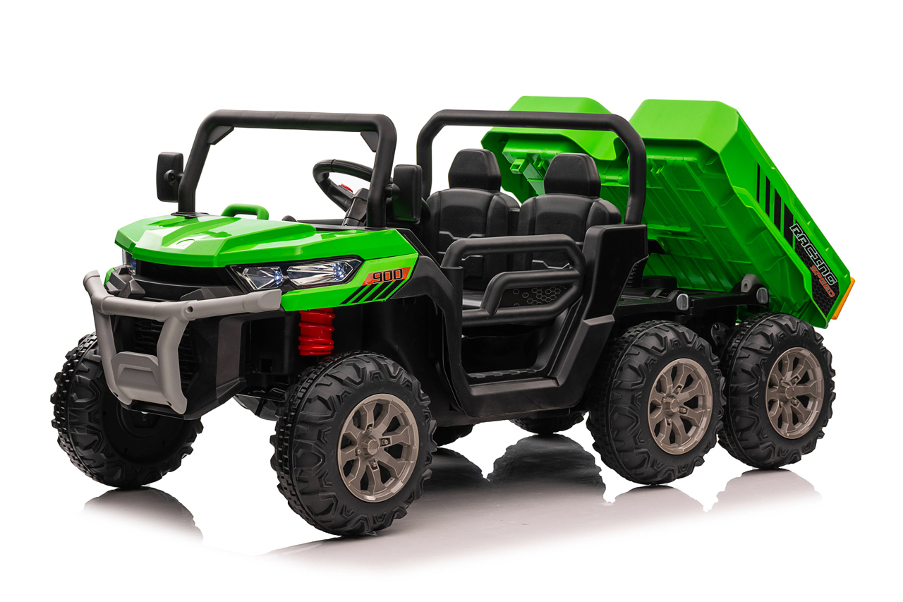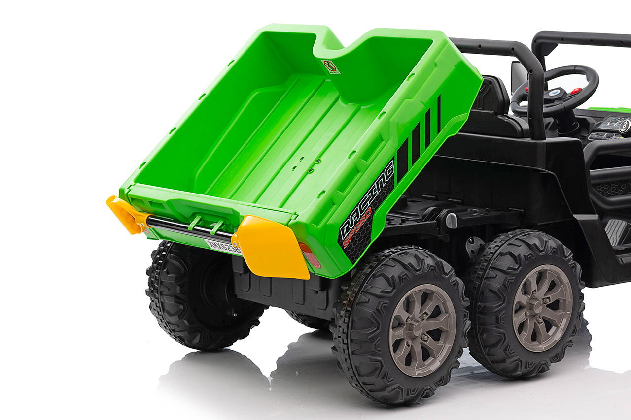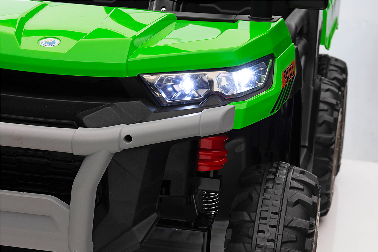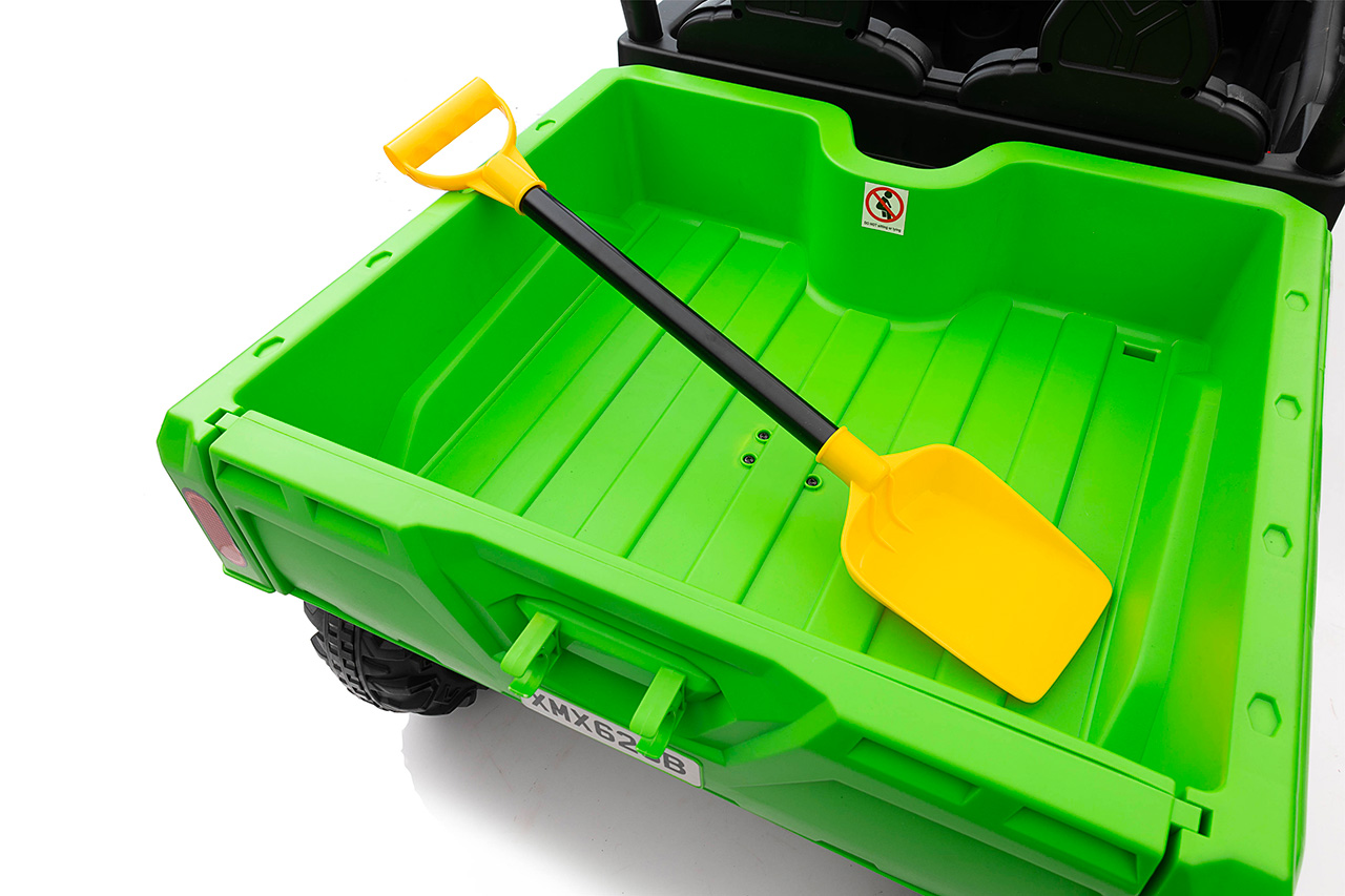 4 motory 24V/120W, prenosný box s batériou 24V/7Ah, elektrická sklápacia korba, nosnosť 50 kg, 2 rýchlosti na manuál / 3 na diaľkové ovládanie, plynulý rozjazd, Bluetooth, USB, AUX, LED svetlá, EVA kolesá, polstrovaná sedačka z eko kože, odpruženie prednej nápravy, ukazovateľ batérie, zvukové efekty, klaksón, otvárateľné dvere, dvojmiestne