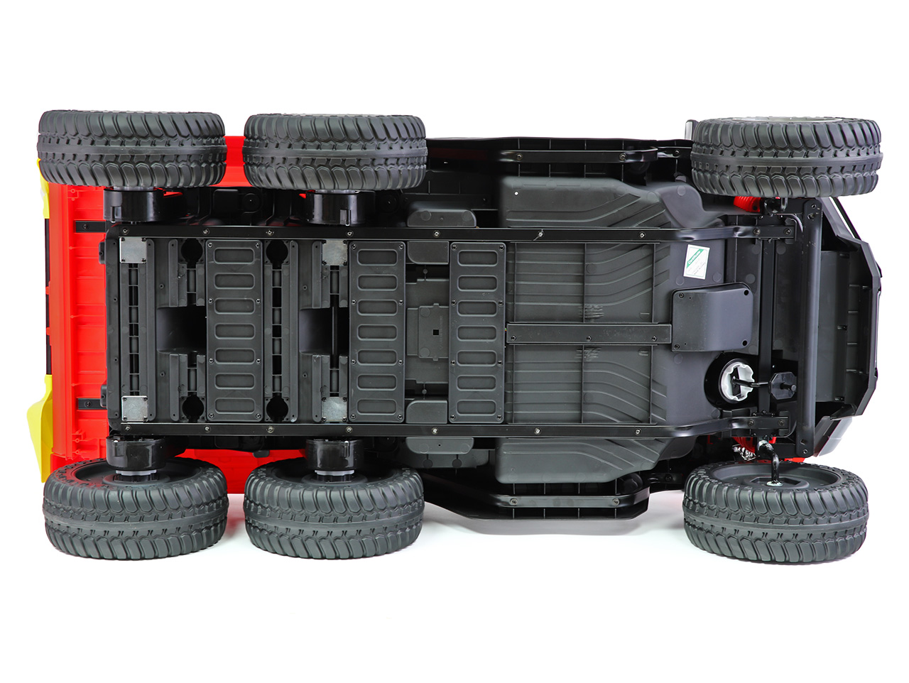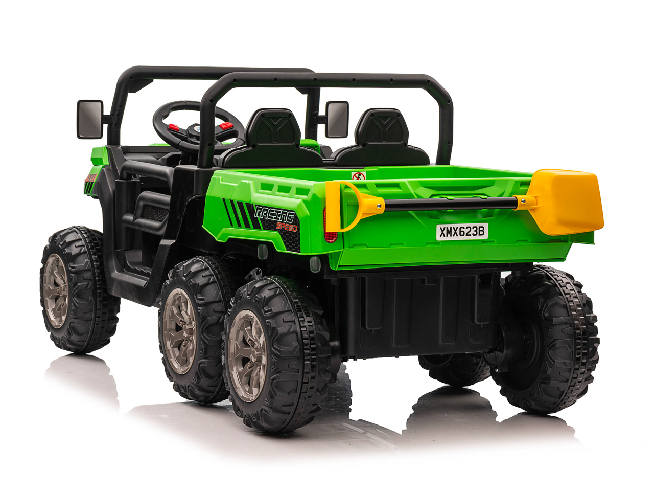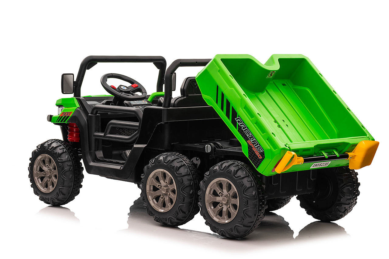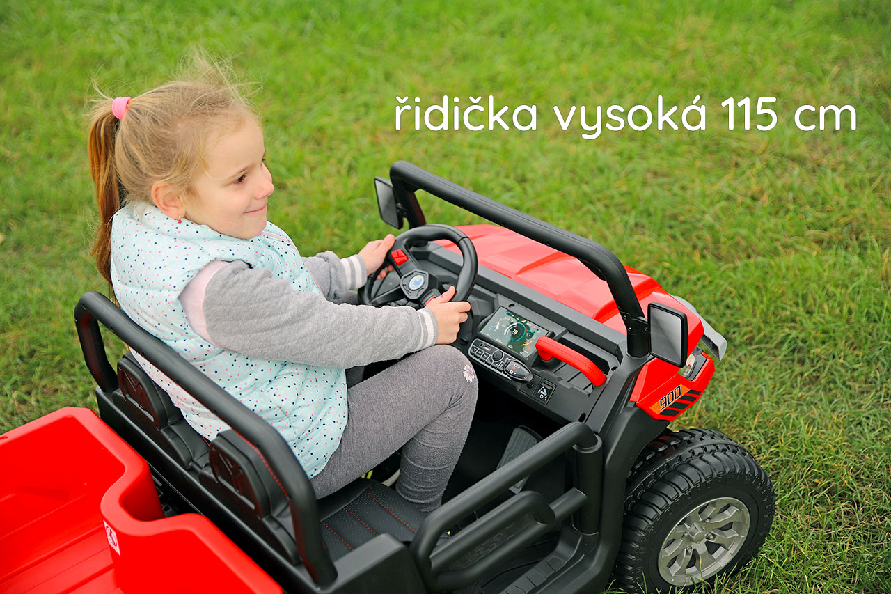 4 motory 24V/120W, prenosný box s batériou 24V/7Ah, elektrická sklápacia korba, nosnosť 50 kg, 2 rýchlosti na manuál / 3 na diaľkové ovládanie, plynulý rozjazd, Bluetooth, USB, AUX, LED svetlá, EVA kolesá, polstrovaná sedačka z eko kože, odpruženie prednej nápravy, ukazovateľ batérie, zvukové efekty, klaksón, otvárateľné dvere, dvojmiestne