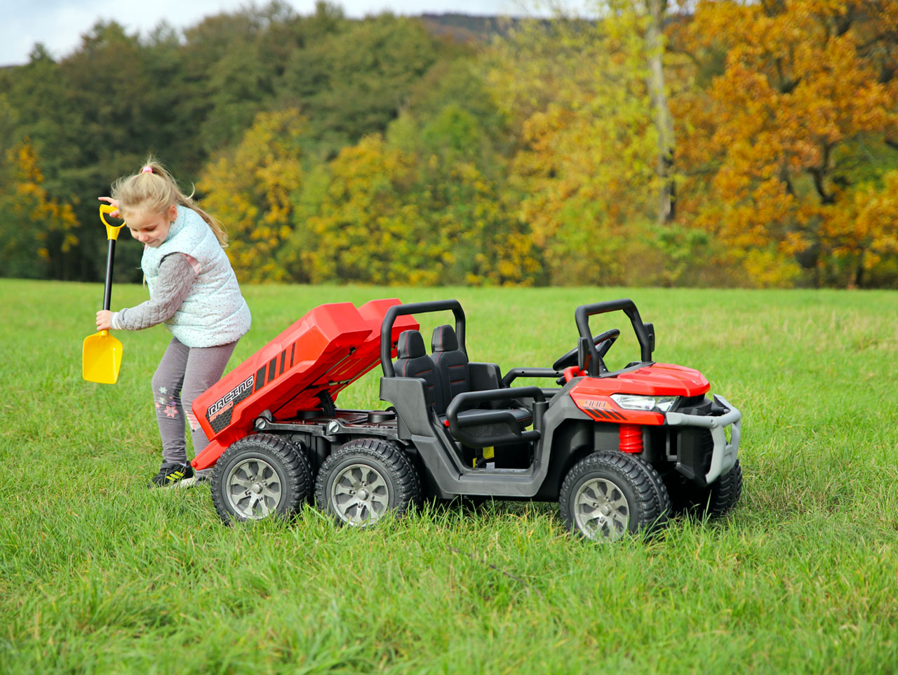 Viete, ako dlho trvá dopraviť dostatočné množstvo materiálu, keď máte len vedierko alebo plastovú tatrovku? Napriek tomu, čo si rodičia myslia, deti nemajú času nazvyš. Musí dielo dokončiť skôr, než ich od neho odtrhneme a zavelíme k odchodu. Texas Farmer rieši všetky problémy. Korba uvezie náklad až do 10 kg , naložíte ho praktickou lopatkou a pri príchode na miesto ho jednoducho vysypete. Korba je totiž elektricky sklopná a ovláda sajedným tlačidlom na prístrojovej doske. Malý staviteľ tak ušetrí čas aj sily. A vy ušetríte nervy, pretože keď dielo stihne dokončiť, nebude sa pred odchodom domov hádať ani vzbudiť. Zvlášť keď sa na cestu domov s volantom v rukách bude tak tešiť.