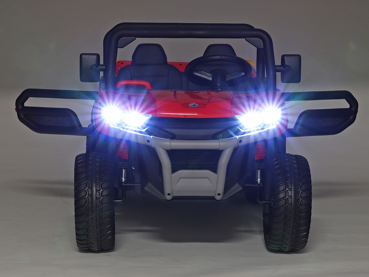 4x motor 24V/120W, box s batériou 24V/7Ah, 2 rýchlosti na manuál / 3 na diaľkové ovládanie (2.4G), nosnosť 60 kg, plynulý rozjazd, Bluetooth, USB, AUX, zvukové efekty, klaksón, predné LED svetlá, EVA kolesá so stredovými ložiskami, čalúnené sedadlá, odpruženie oboch náprav, zadná náprava s nastaviteľnou tuhosťou tlmičov, ukazovateľ stavu batérie, trojmiestne