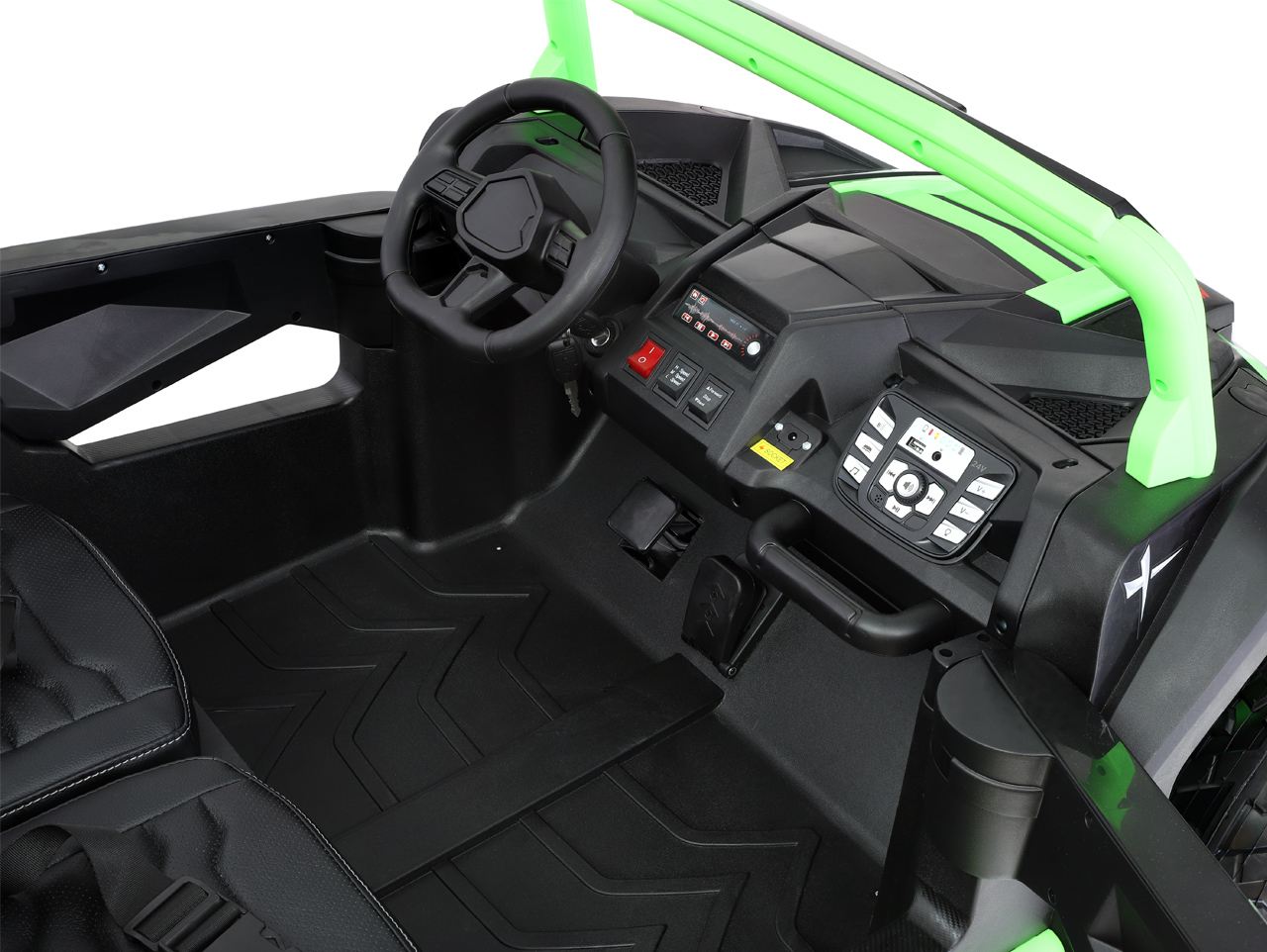 4 motory 24V/200W, 2 batérie 24V/7Ah spojené do 24V/14Ah, 2 rýchlosti na manuál / 3 na diaľkové ovládanie (2.4G), nosnosť 60 kg, plynulý rozjazd, veľké EVA kolesá so stredovými ložiskami, polstrované sedačky, odpruženie tlmičov, bluetooth, USB, AUX, zvukové efekty, klaksón, predné LED svetlá, ukazovateľ stavu batérie, trojmiestny