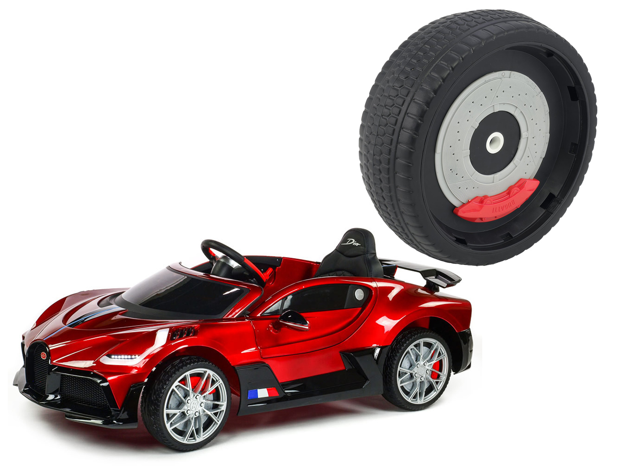 Určené pre detské elektrické autíčko Bugatti Divo (model číslo HL338). Bicykel je univerzálny, je teda možné použiť na ktorúkoľvek stranu. Vyrobené z EVA materiálu. Priemer 235 mm, šírka 78 mm, možno nasadiť na os s priemerom 12 mm. Celý popis