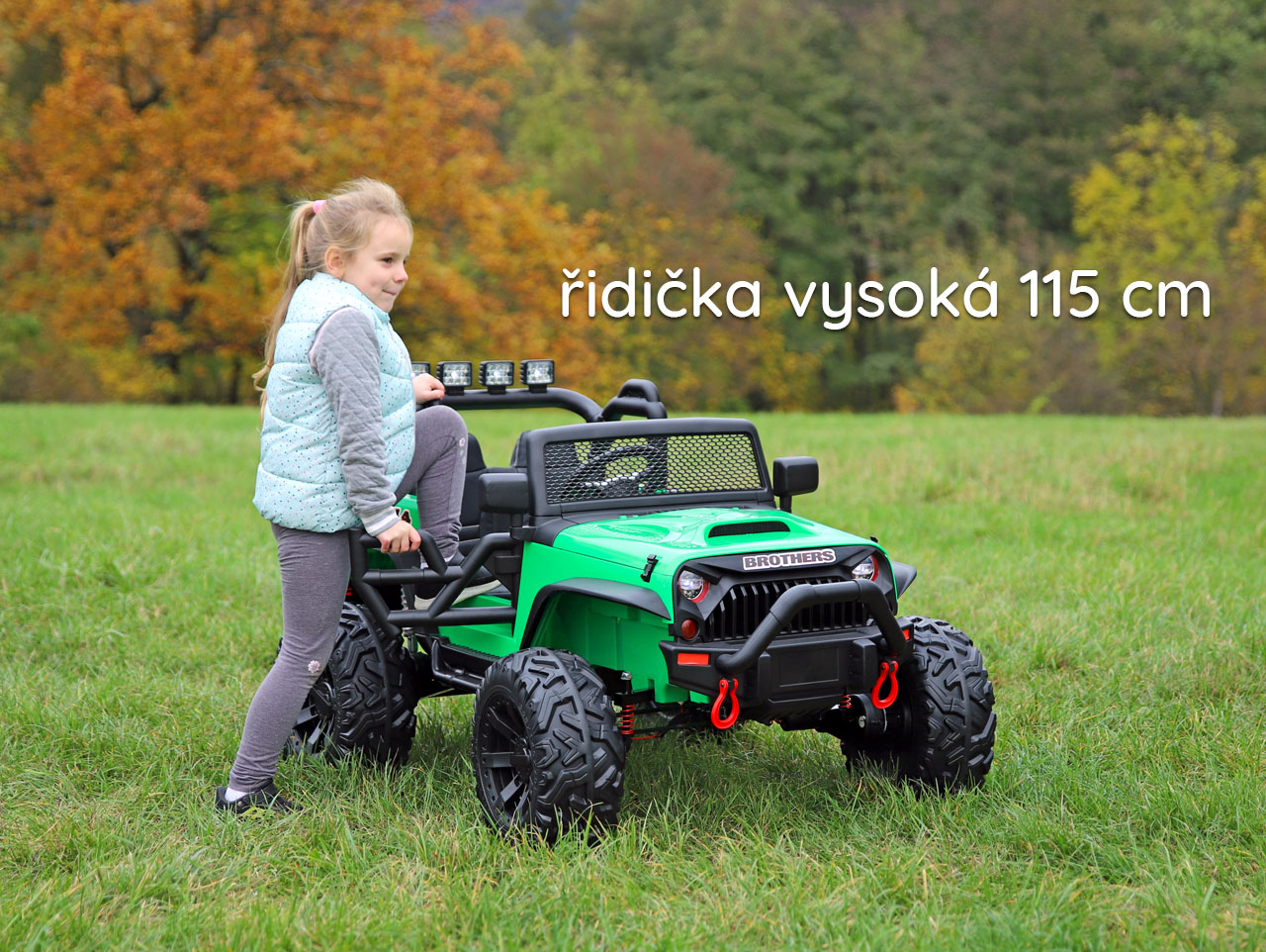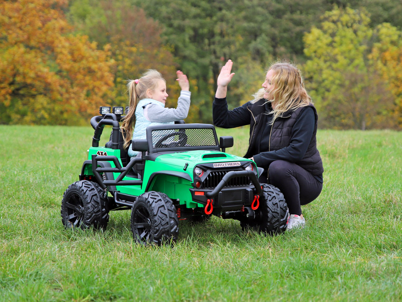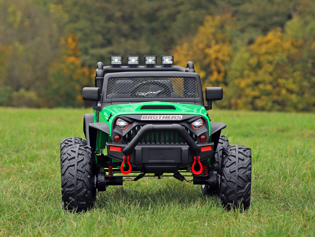 Džíp Brothers naozaj neklame telom, robustný vzhľad dopĺňa nadpriemerný výkon, takže zvládne aj ľahší terén. S týmto autíčkom sa nemusíte motať len okolo domu alebo sa nechať obdivovať na pešej zóne, vydajte sa do prírody. Zdolajte nespevnenú cestu smerom k lesu alebo prekonajte lúku za domom. Všetky štyri kolesá poháňajú motory s výkonom 24V/200W. S celkovým výkonom 800 W tak džíp Brothers patrí k najvýkonnejším autíčkam na trhu. Aj podvozok je o poznanie vyšší, takže prekonávanie drobných nerovností bude o niečo plynulejšie.