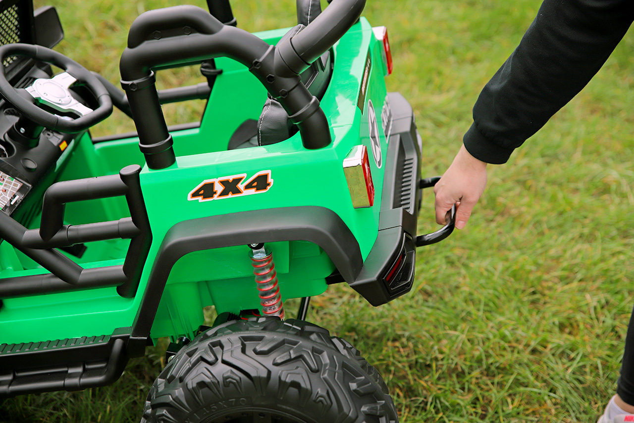 4 motory 24V/200W, 2x batéria 12V/7Ah spojené do 24V/7Ah, 2 rýchlosti na manuál / 3 na diaľkové ovládanie (2.4G), plynulé rozjazdy, polstrované sedadlo z ekokože, EVA kolesá, odpruženie oboch náprav, Bluetooth, USB, AUX, LED svetlá, zvukové efekty, otvárateľné dvere, držadlo na ručné ťahanie, ukazovateľ stavu batérie Celý popis