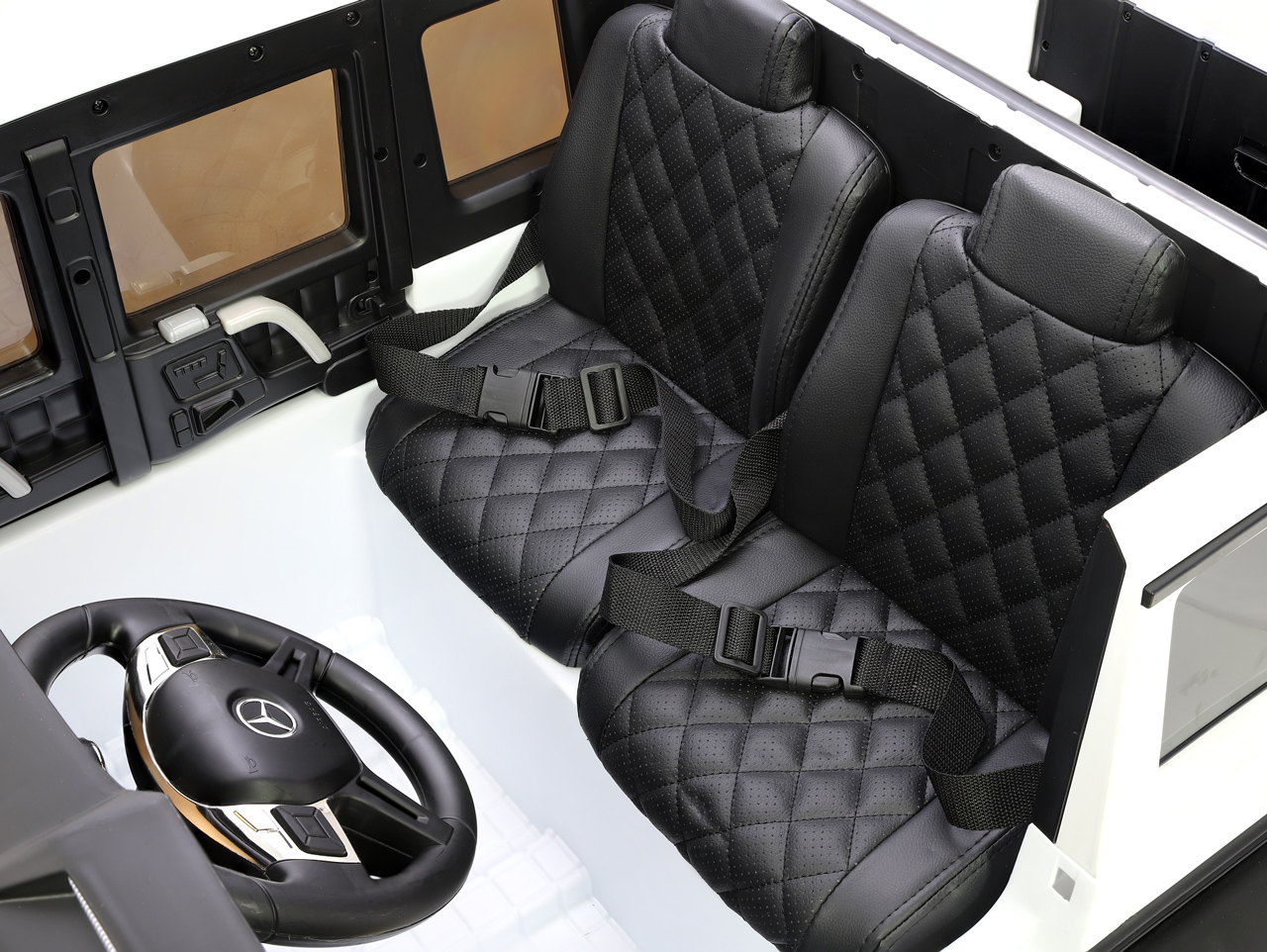 Autíčko má dvojmiestnu sedačku s poťahom z eko kože . Celkový vnútorný priestor na sedenie je 54 cm, takže súrodenci sa zmestia bez problémov . Model G63 6x6 zvládne zaťaženie až 60 kg, čo ho radí medzi elektrické autíčka s najvyššou nosnosťou na trhu.