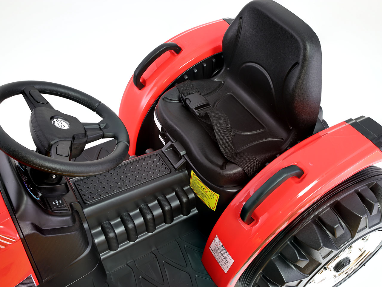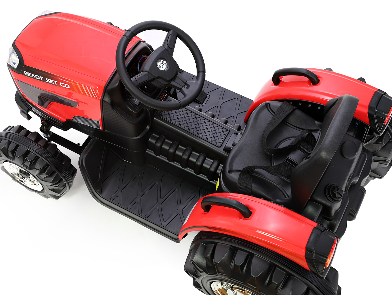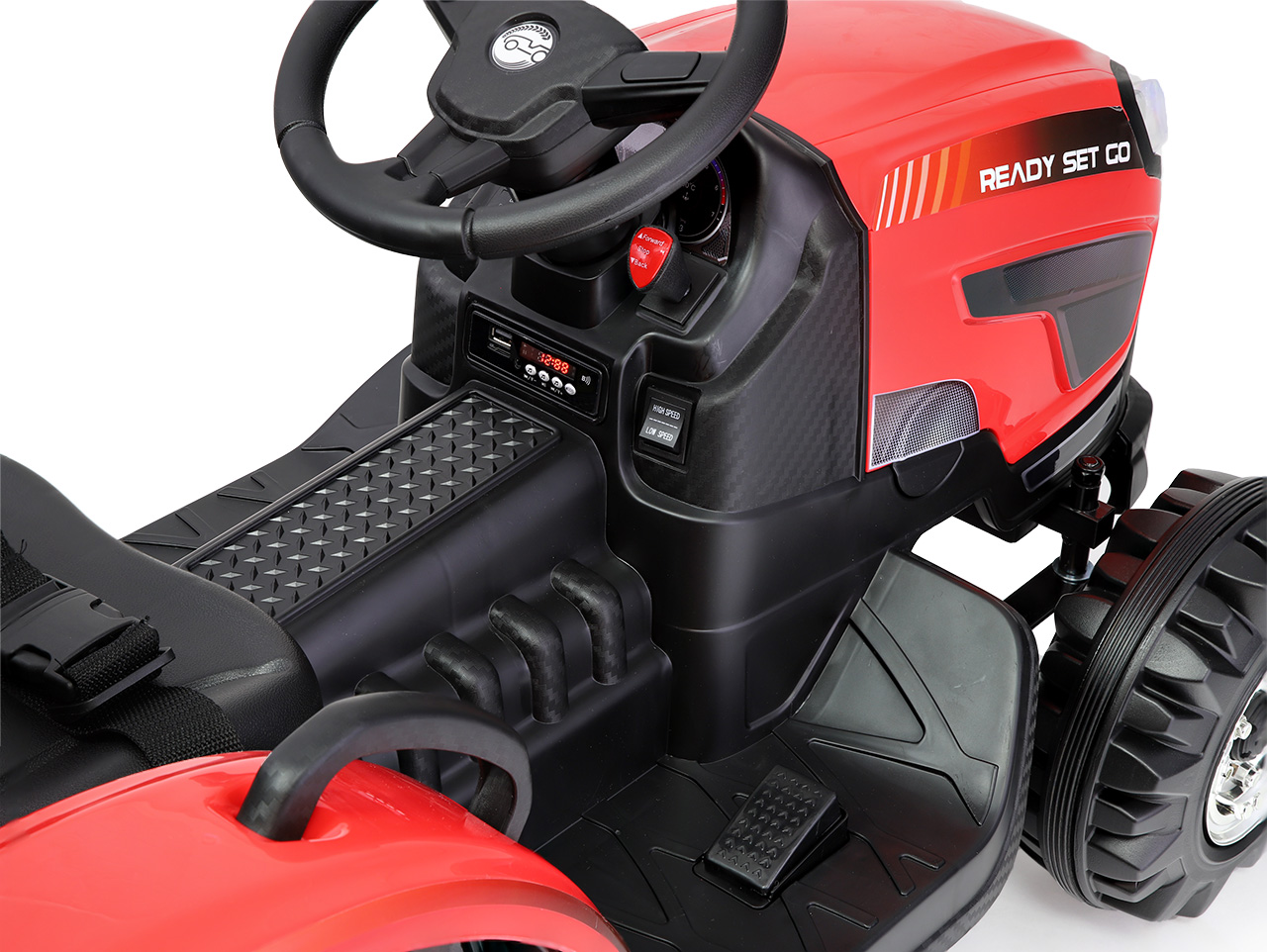 Vieme, čo dokážu s inak poslušnými deťmi urobiť emócie, preto nechávame konečné slovo v ruke vám v podobe diaľkového ovládania. To má prednosť pred manuálnym riadením. Je jedno, ako zverepe sa dieťa tvári, keď stojí na plyne, vy ho na diaľku zastavíte. Ovládač sa páruje vďaka pripojeniu 2.4 G priamo s konkrétnym vozidlom, nikto váš signál rušiť nebude. Na ovládači nájdete prepínanie medzi 3 rýchlosťami a tlačidlá pre ovládanie smeru. Traktórik tak bez starosti dopravíte domov, nech v ňom sedí dieťa alebo napríklad nákup.