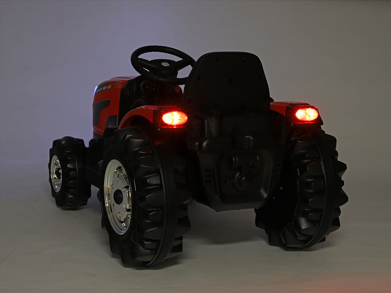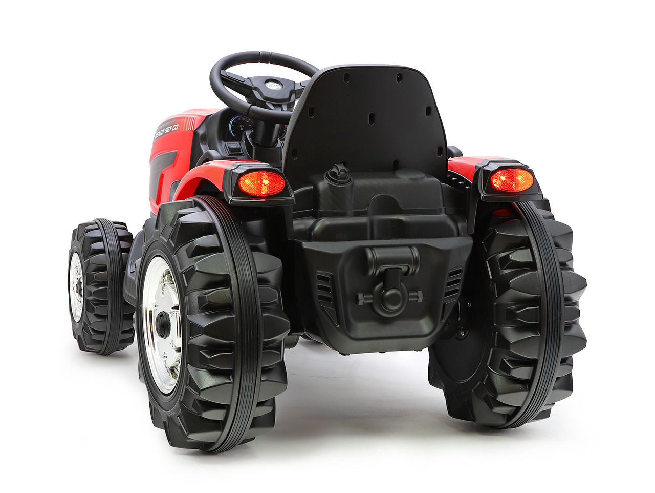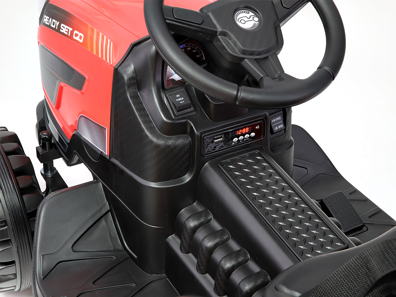 Vieme, čo dokážu s inak poslušnými deťmi urobiť emócie, preto nechávame konečné slovo v ruke vám v podobe diaľkového ovládania. To má prednosť pred manuálnym riadením. Je jedno, ako zverepe sa dieťa tvári, keď stojí na plyne, vy ho na diaľku zastavíte. Ovládač sa páruje vďaka pripojeniu 2.4 G priamo s konkrétnym vozidlom, nikto váš signál rušiť nebude. Na ovládači nájdete prepínanie medzi 3 rýchlosťami a tlačidlá pre ovládanie smeru. Traktórik tak bez starosti dopravíte domov, nech v ňom sedí dieťa alebo napríklad nákup.