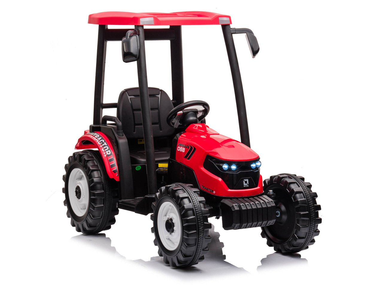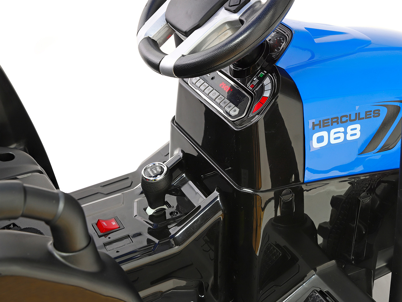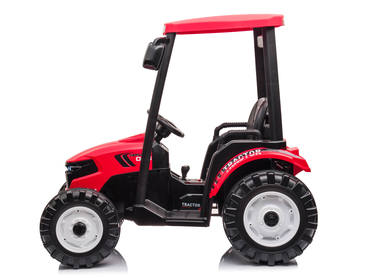 Čo robí traktor traktorom? Klasický tvar karosérie pripomínajúci živého tvora. Vysoká kabína, masívne, tvarované a široké kolesá – tie zadné o poznanie väčšie ako tie predné. Tak presne to náš elektrický traktor Hercules spĺňa. Dizajn sme vyladili do posledného detailu vrátane spätných zrkadiel, predných LED svetiel, autentickej radiacej páky a imitácie tachometra na prístrojovej doske. Toto elektrické vozidlo tak má všetko, čo váš malý raubír traktoristom okolo závidí.