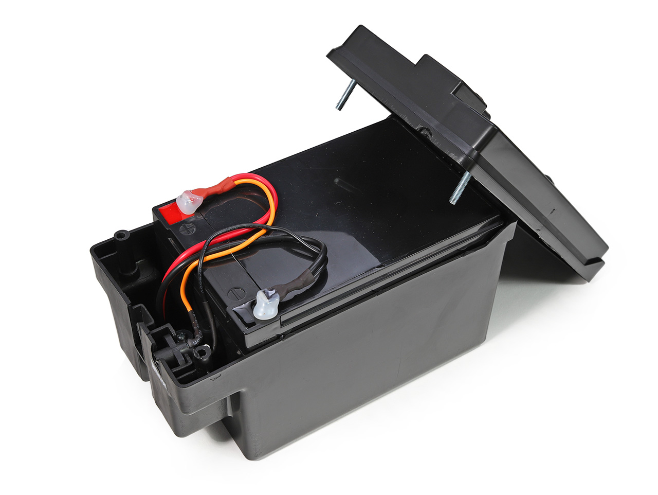 Súčasťou boxu je batéria 12V/14Ah , resetovacia poistka a nabíjacia zásuvka. Vďaka zabudovanej nabíjacej zásuvke je možné batériový box dobíjať mimo autíčko .
