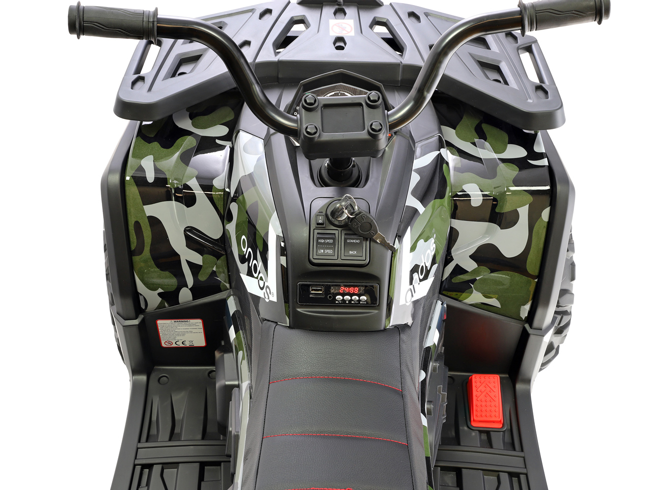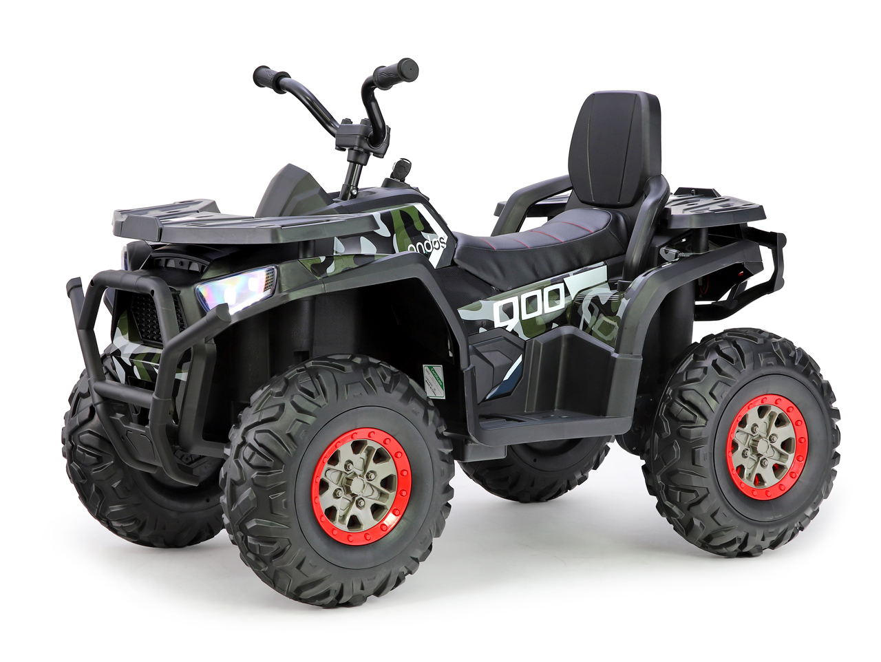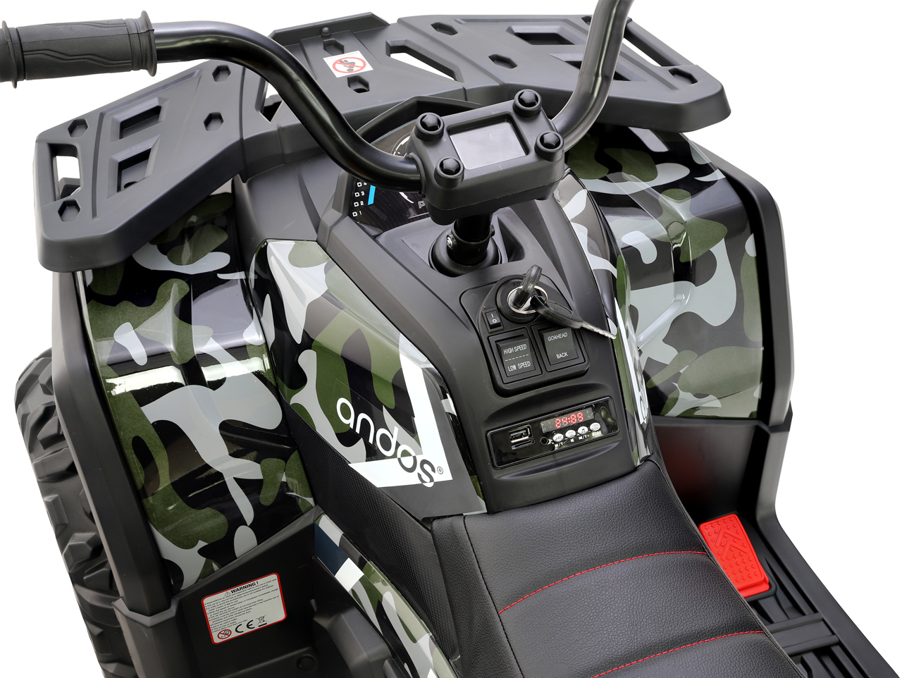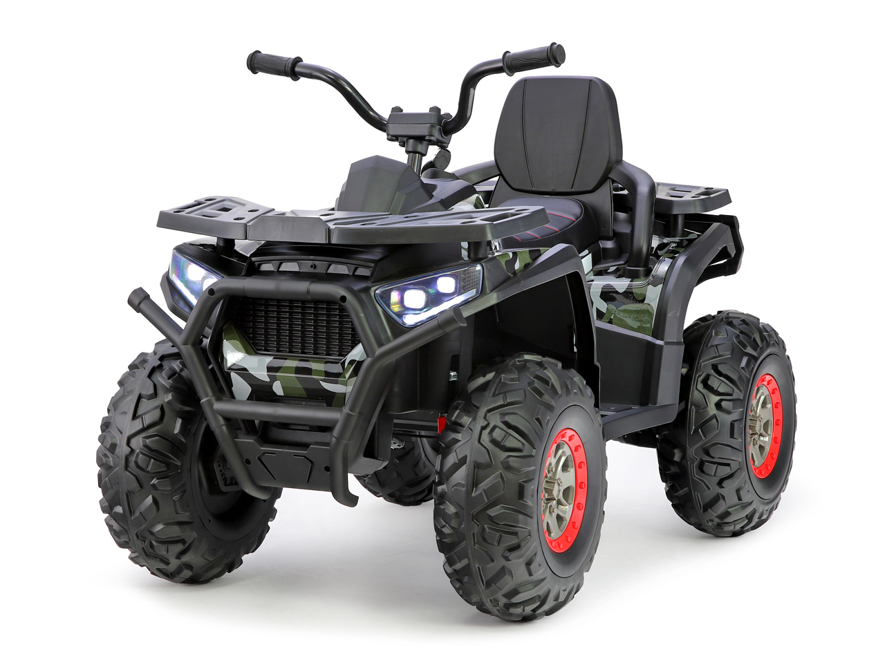 2 motory 24V/200W, 2 batérie 12V/7Ah spojené do 24V/7Ah, 2 rýchlosti na manuál / 3 na diaľkové ovládanie, rýchlosť až 8 km/h, nosnosť 50 kg, plynulý rozjazd, polstrovaná sedačka, EVA kolesá, odpruženie zadnej nápravy, predné a zadné rádio, ukazovateľ stavu batérie, štartovacie klíčky, lesklá povrchová úprava camo, opierka chrbta pre maximálnu bezpečnosť