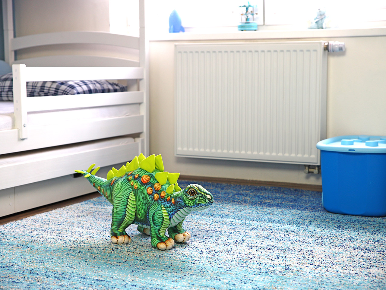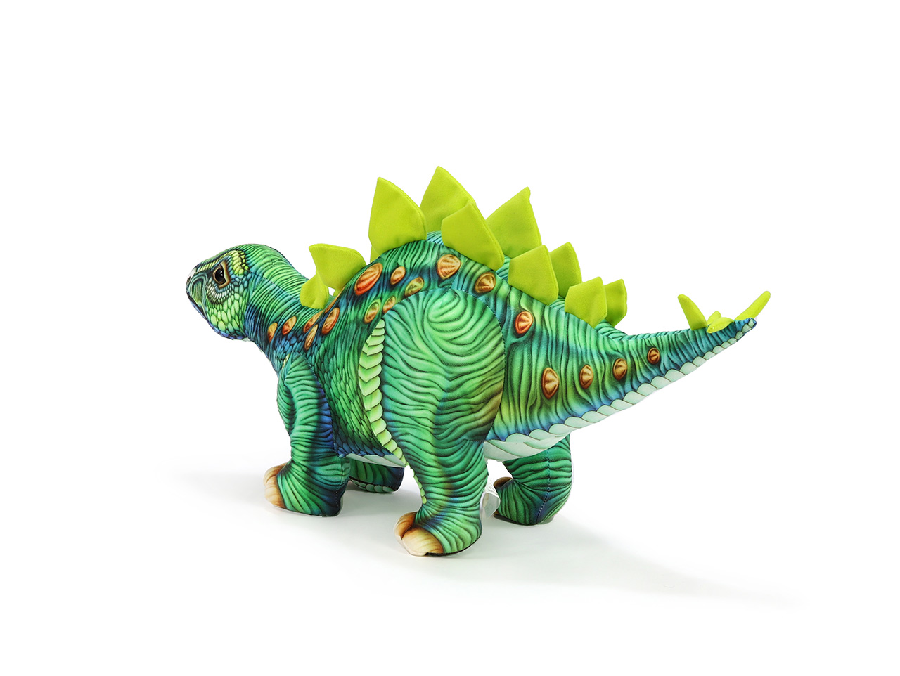 Náš plyšový dinosaurus má krásnu pestrú farbu. Keďže vedci v skutočnosti netušia, ako boli dinosaury farební, môžeme si dovoliť s farbami experimentovať Dúhovo zelená rozžiari každú izbu alebo herňu ako parádna dekorácia. Náš plyšový stegosaurus má tak rohovitú kožu plnú vrások, záhybov a rožkov, a pritom sa k nemu môže túliť aj jemná detská tvárička. Jeho povrch je ľahko umývateľný , žiarivá farba mu teda dlho vydrží.