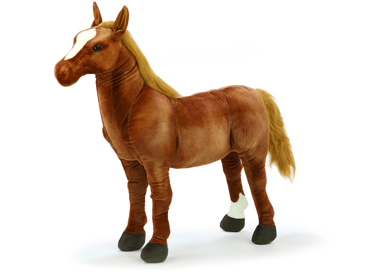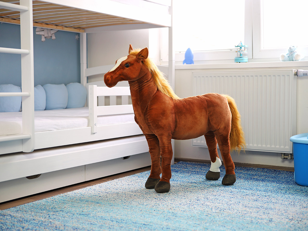 Náš plyšový kôň je dokonalý arabský plnokrvník. Jemný, ľahko vykrojený profil, štíhle nohy, ušľachtilá hlava, múdry pohľad a bujná hriva. K tomu krásna lesklá srsť, ktorá rovnako ako u skutočných arabov nevyžaduje veľa údržby . Možno ju len utrieť vlhkou handričkou a bude sa zase lesknúť, ako keď plyšový koník vyskočil z krabice. Na svojich ladných nohách stojí pevne , všili sme do nich totiž kovovú výstuhu. Tá je úplne bezpečná, avšak neumožňuje sedenie na chrbte. Náš plyšový kôň je predsa len trochu fajnovka, žiadny jazdecký or – na ozdobu a na maznanie ho však užije.