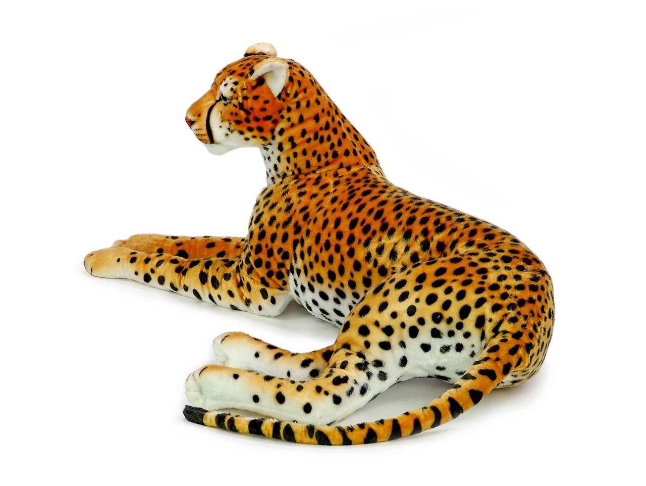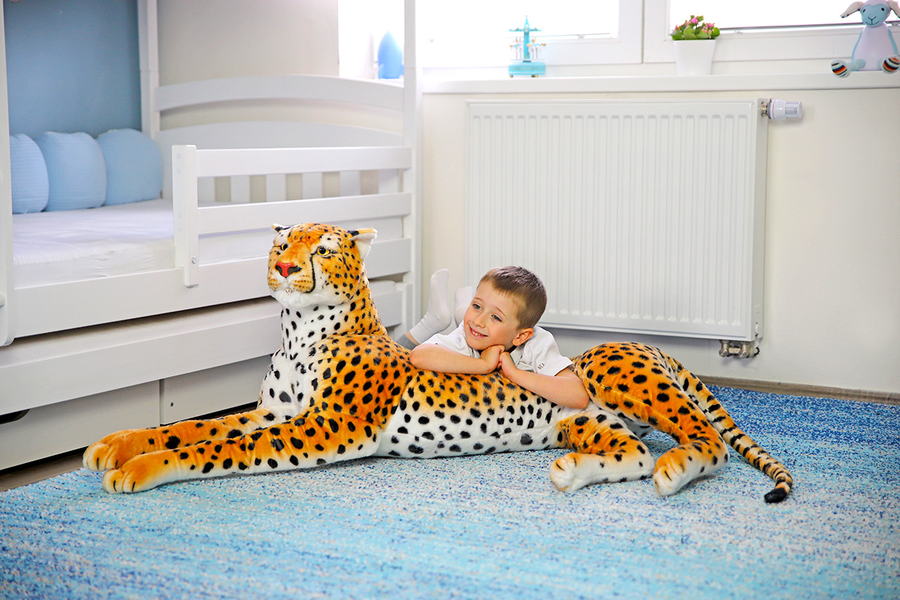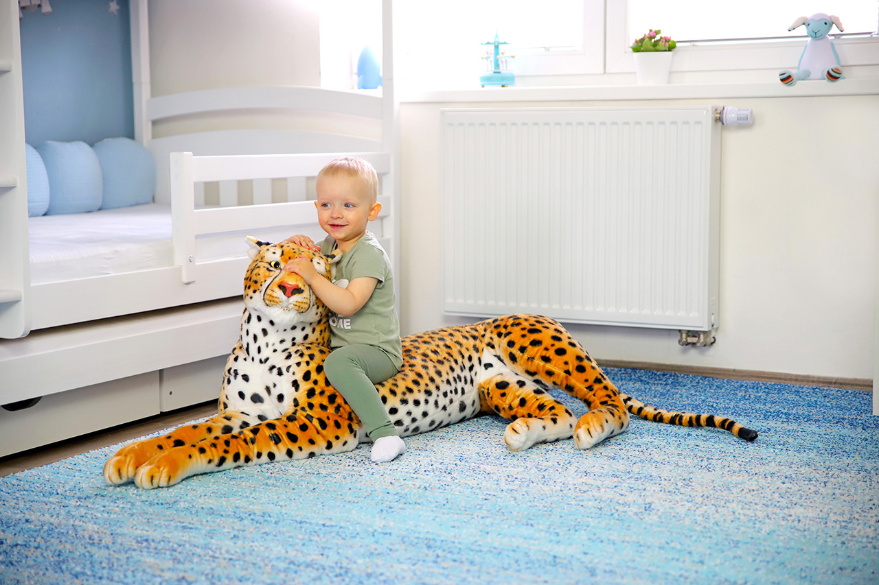 Náš veľký plyšový gepard vyzerá ako živý. Vyhrali sme si so škvrnami na srsti aj s autentickým sfarbením hlavy, ktoré ho bezpečne odlišuje od ostatných mačkovitých šeliem. Vďaka dĺžke 132 cm poslúži jeho štíhle telo ako váľanda, vankúš alebo skvelý detský spoločník. Ako všetci naši plyšáci totiž vedia výborne počúvať. Jeho srsť je mäkká a príjemná na dotyk a tiež ľahko umývateľná. Keď sa zašpiní, stačí utrieť vlhkou handričkou a zase bude žiariť novotou.