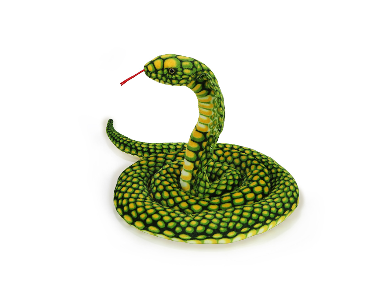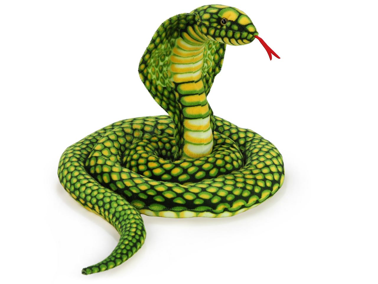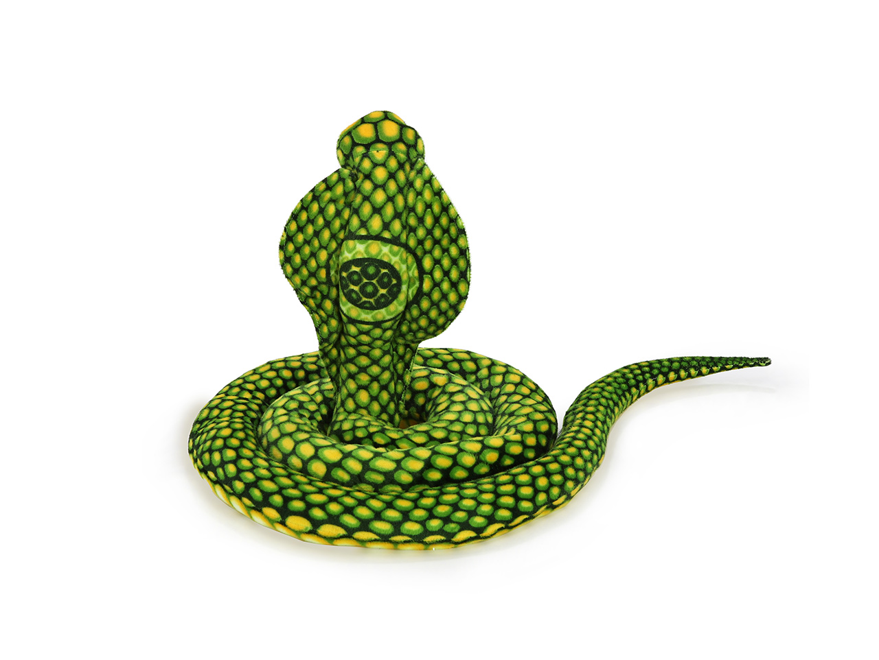 Plyšový had druhu kobra kráľovská v nádhernom zelenom variante ozvláštni každú detskú izbičku. Jej ľahko umývateľný a hebký povrch napodobňuje kresbu na šupinách skutočnej kobry, len jej dodáva svieže zelené tóny. Náš veľký plyšový had je o niečo väčší ako skutočná kobra. Tá v prírode nesadí ani tak na svoju veľkosť, ako na svoj smrteľný jed, neskutočnú rýchlosť a obratnosť. Plyšová kobra sa stane ideálnym spoločníkom na maznanie alebo vankúšom do postieľky. Mäkký plyš je príjemný na pohmat a veľká je tak akurát, aby podoprela detskú hlavičku.