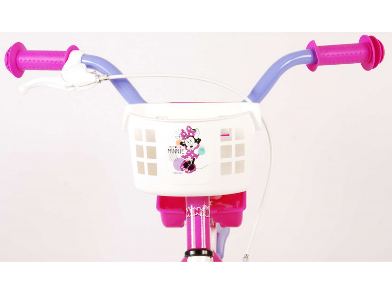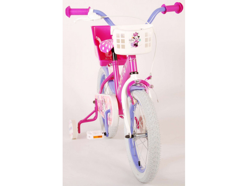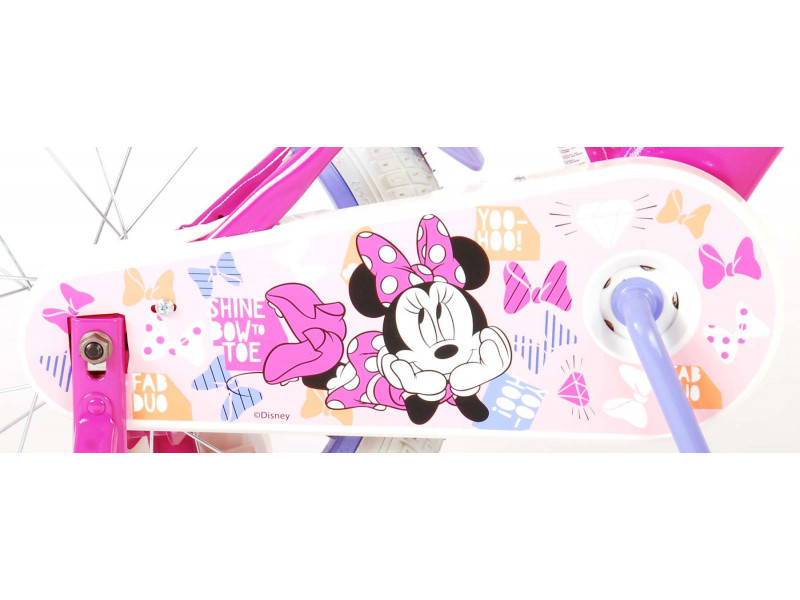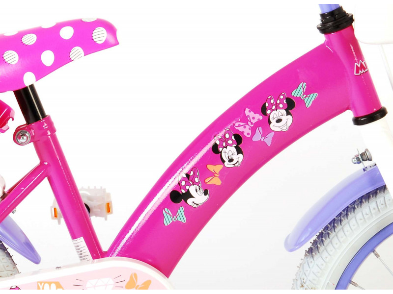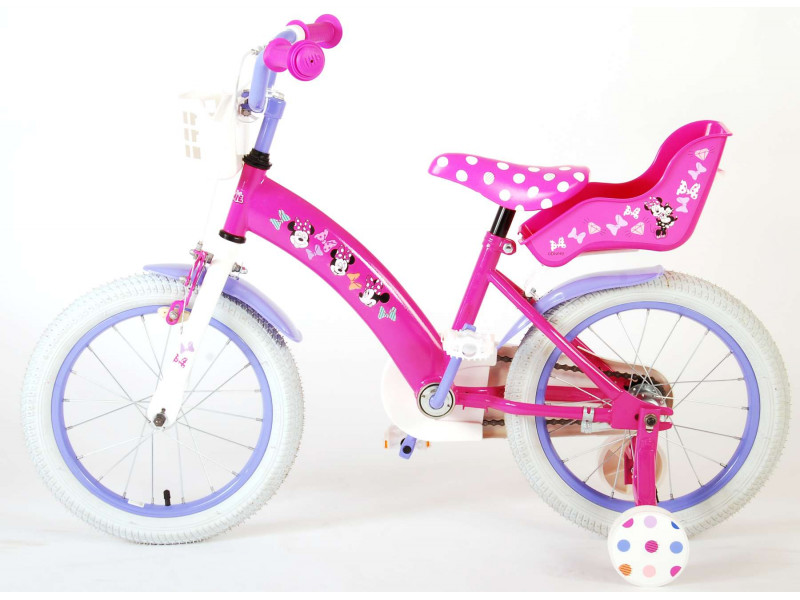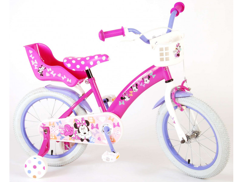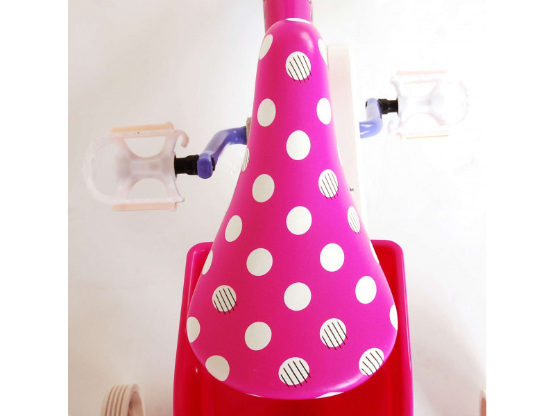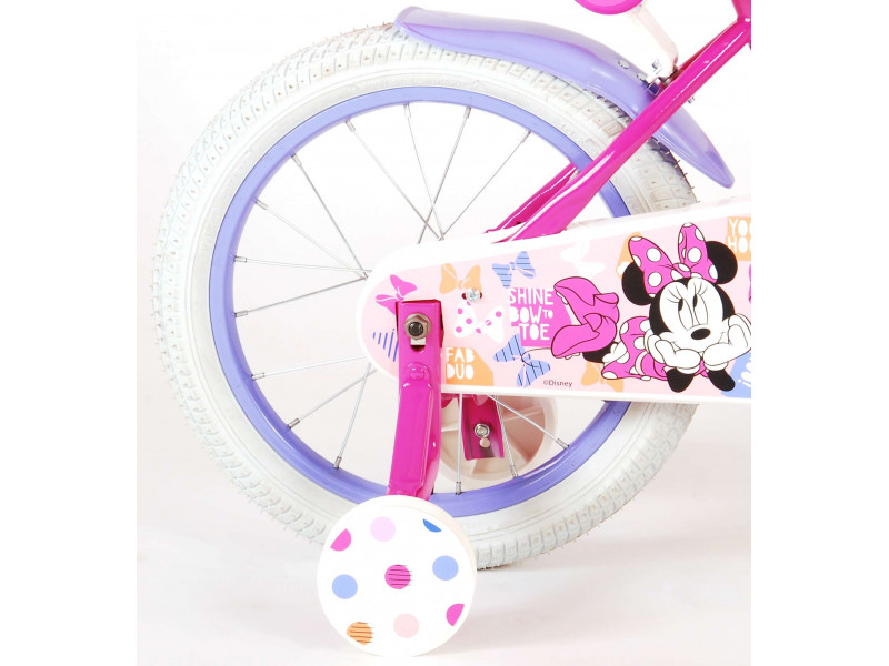 Detský bicykel vyrobený špeciálne pre fanynky disneyovskej postavičky Myšky Minnie, vhodné pre deti vo veku od 4 do 6 rokov. Pokiaľ zháňate prvé kolo, na ktorom by sa malá cyklistka mohla naučiť ľahko a bezpečne jazdiť, potom je tento model skvelou voľbou. Bicykel je vybavený kvalitným rámom z ocele, 16palcovými oceľovými ráfikmi s nafukovacími plášťami, blatníkmi, sedačkou pre bábiku a predným košíkom. Bicykel disponuje nožnou protismernou brzdou v kombinácii s prednou čeľusťovou (ručnou) brzdou. Nemusíte tak mať vôbec obavy, že by dieťa nebolo schopné s bicyklom dostatočne brzdiť. Kombinácia nožnej a čeľusťovej brzdy navyše dieťaťu umožní postupne si zvyknúť na brzdenie ručnými brzdami , čo príde vhod pri neskoršom prechode na väčšie koleso. V začiatkoch dieťaťu pomôžu aj prídavné balančné kolieska. Vo výbave je ďalej uzavretý kryt reťaze, ktorý chráni dieťa pred kontaktom s reťazou a zároveň chráni samotnú reťaz pred poškodením. Dizajn spestrí rad roztomilých nálepiek a potlačí s motívom Butiku myšky Minnie. Bicykel je opatrený všetkými potrebnými bezpečnostnými certifikátmi.