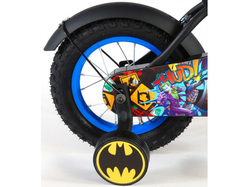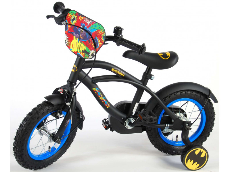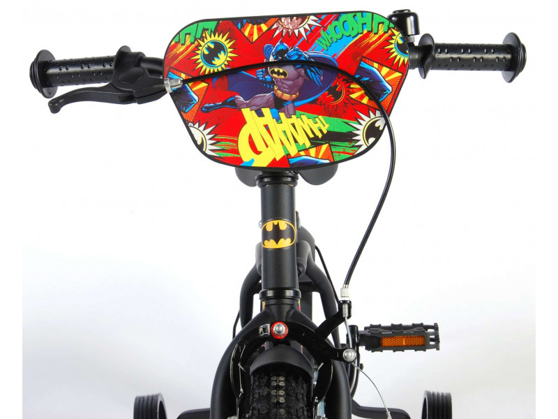 koleso 12 palcov, rám z ocele, oceľové ráfiky s nafukovacími plášťami, zadná protismerná brzda + predná čeľusťová (ručná) brzda, uzavretý kryt reťaze, balančné kolieska, zvonček, vhodné pre deti od 3 do 4,5 rokov / veľkosť oblečenia 92-104 , z 85 % zostavené, licencia Batman, čierne Celý popis