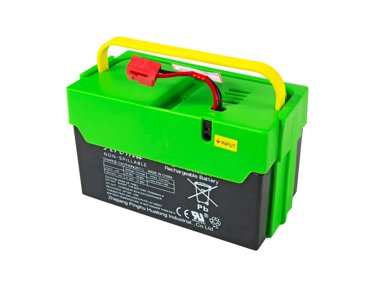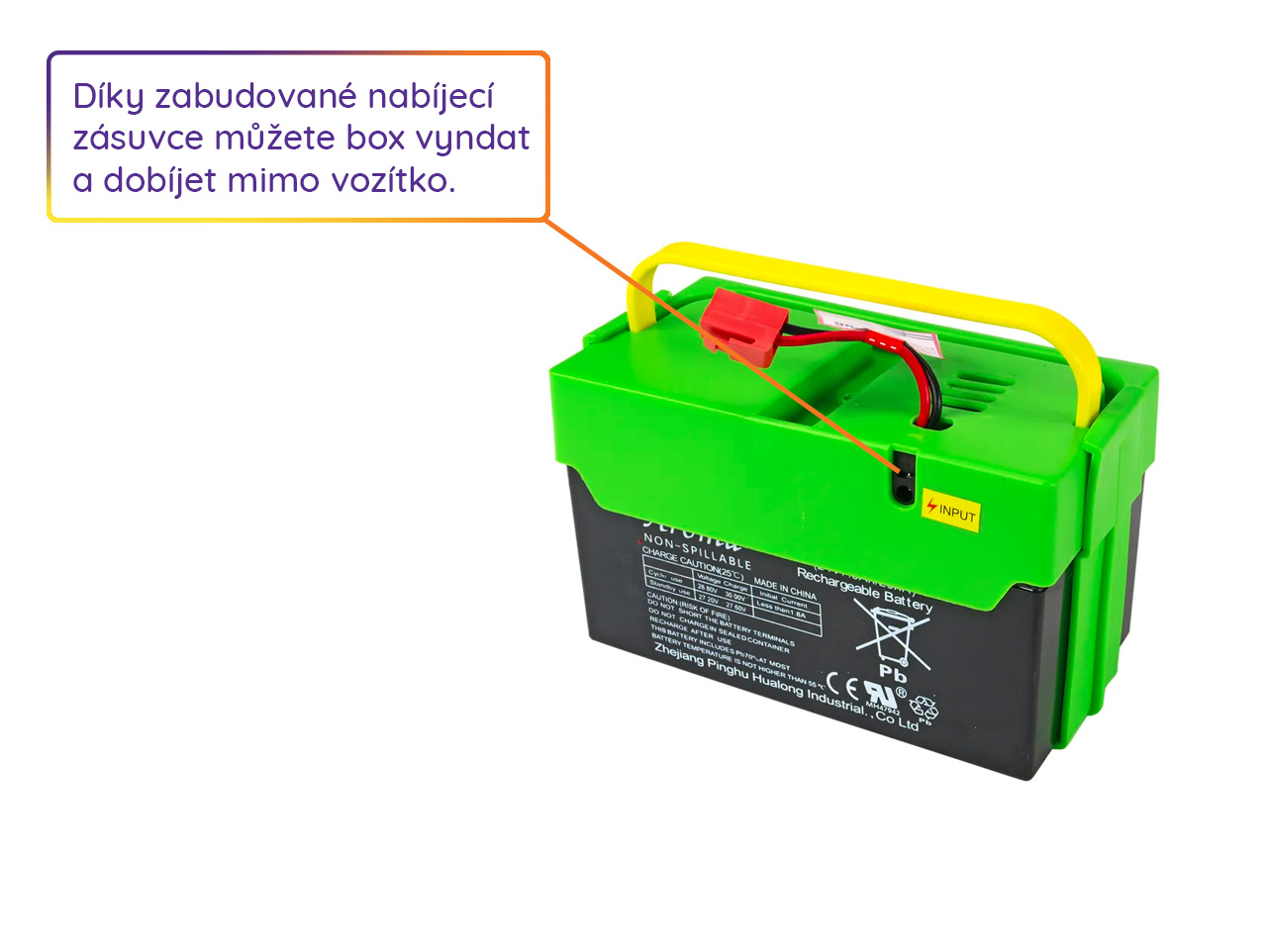 Súčasťou boxu je batéria 24V/7Ah, resetovacia poistka a nabíjacia zásuvka. Vďaka zabudovanej nabíjacej zásuvke je možné batériový box dobíjať mimo buginy.