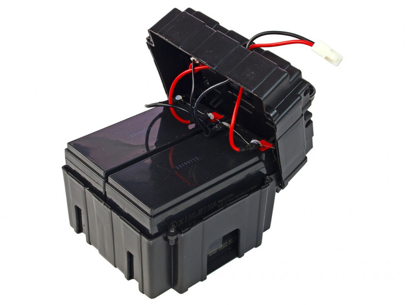 plastový batériový box s vekom a ručným madlom, súčasťou sú 2 batérie 12V/7Ah, zabudovaná nabíjacia zásuvka (možno dobíjať mimo autíčka), resetovacia poistka, konektor na pripojenie k autíčku vrátane všetkých káblov, určený pre elektrické autíčko Mercedes-Benz AMG G63 (šesťkolesový )