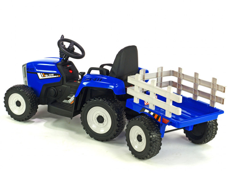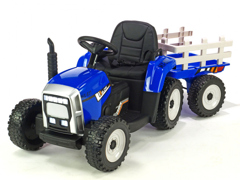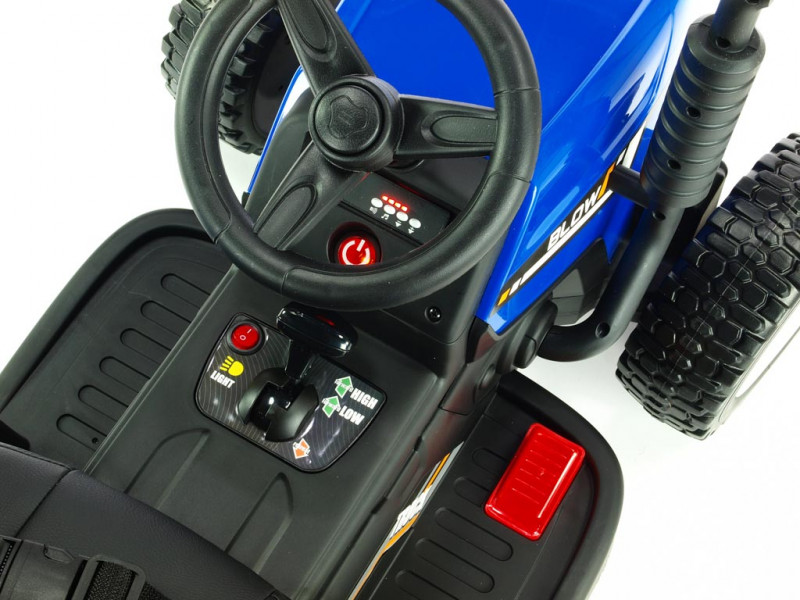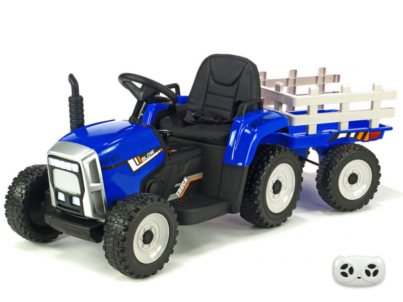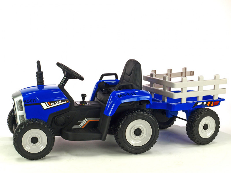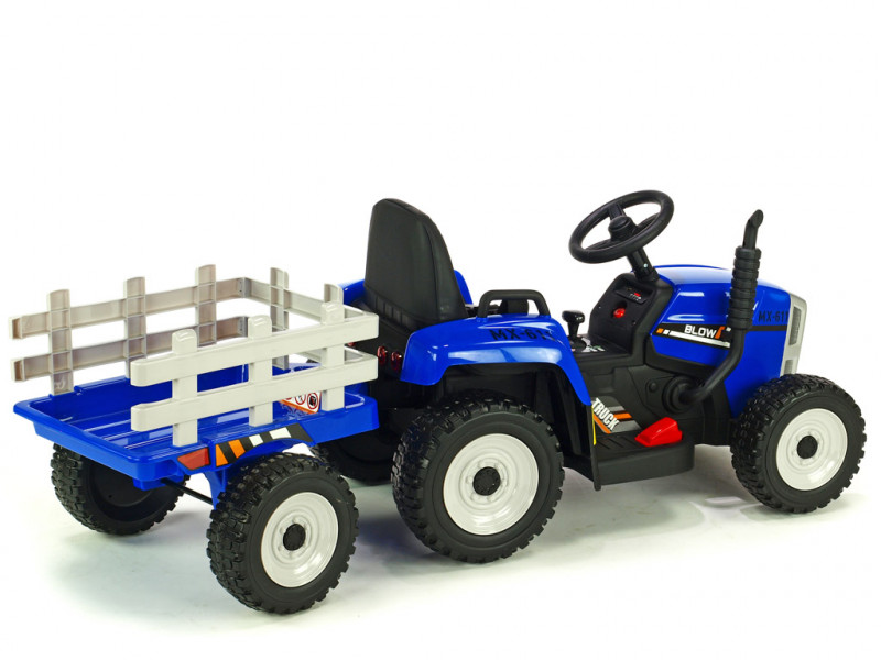 Traktorček Blow MX-611 je vybavený dvoma silnými motormi (2x 12V / 45W), ktoré poháňa obe zadné kolesá. Všetky kolesá sú vyrobené z tzv. EVA polyméru - pružného materiálu na báze gumy s vynikajúcimi tlmiacimi vlastnosťami. Jazda po tvrdom povrchu je v porovnaní s plastovými kolesami značne príjemnejšia. K pohodliu prispeje aj príjemná čalúnená sedačka, ktorá je opatrená bezpečnostným pásom. Pod volantom sa nachádza tlačidlo pre zapnutie/vypnutie predných LED svetiel, hudobný prehrávač a LED indikátor stavu batérie. Vo volante je zabudovaný vzduchový klaksón. Deti k svojmu traktoru dostanú aj prípojný vlek, na ktorom môžu prevážať náklad do 5 kg.