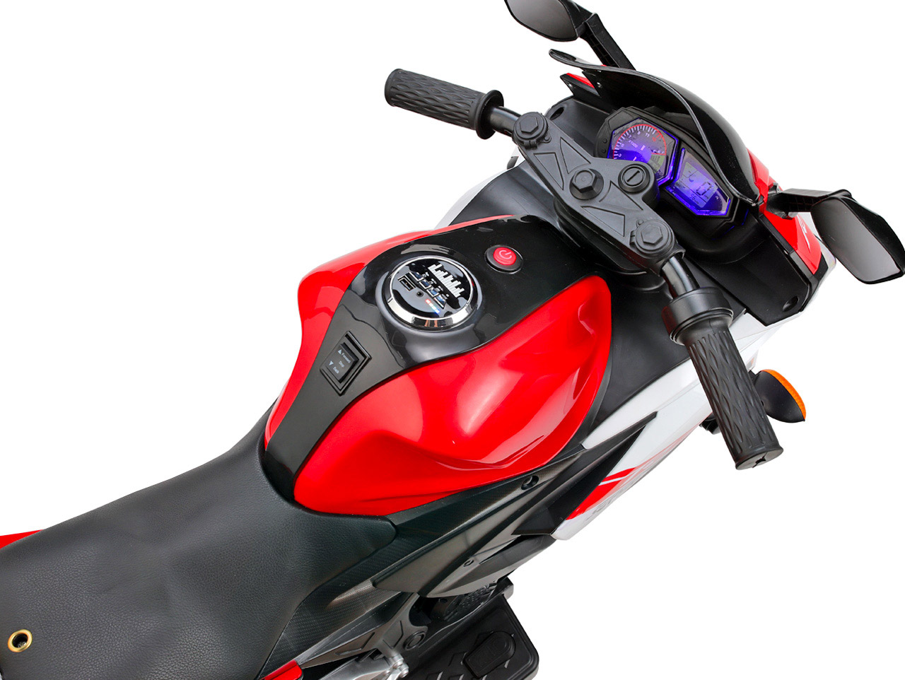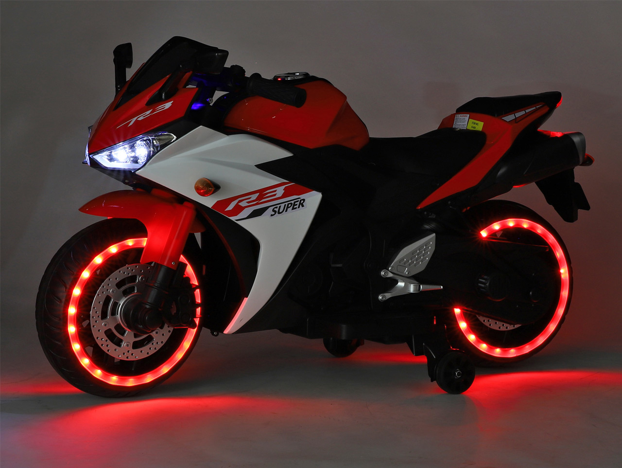 Za vyzdvihnutie stojí naozaj štýlové LED osvetlenie , čo s deťmi oceníte najmä pri jazde v šere. Superšport R3 je vybavená svietiacimi prednými aj zadnými svetlami a osvetlenými palubnými prístrojmi. Tým najzaujímavejším prvkom sú tu ale svietiace ráfiky oboch kolies, ktoré v tme žiaria červenou farbou .