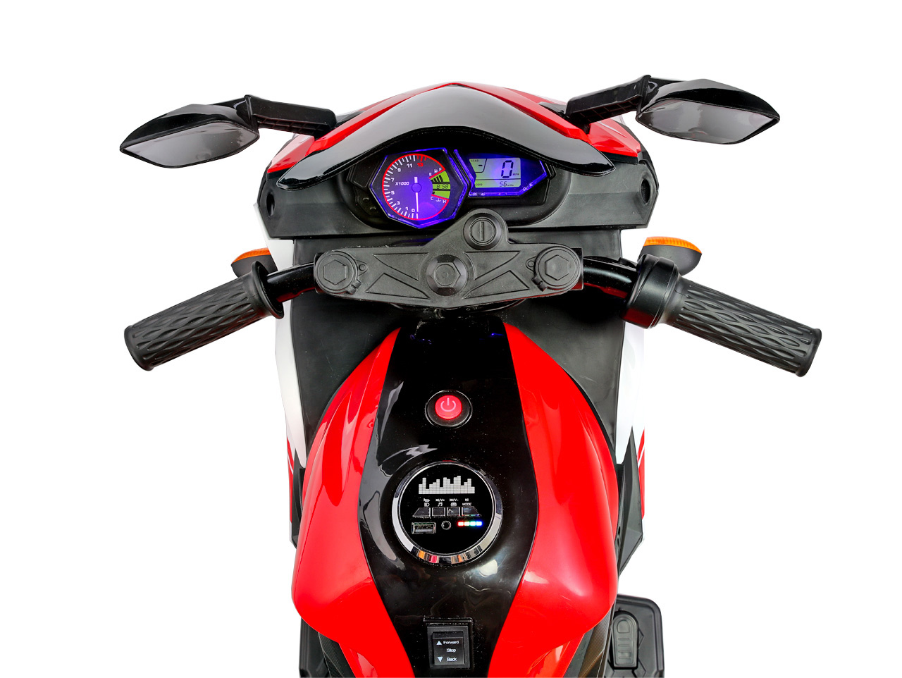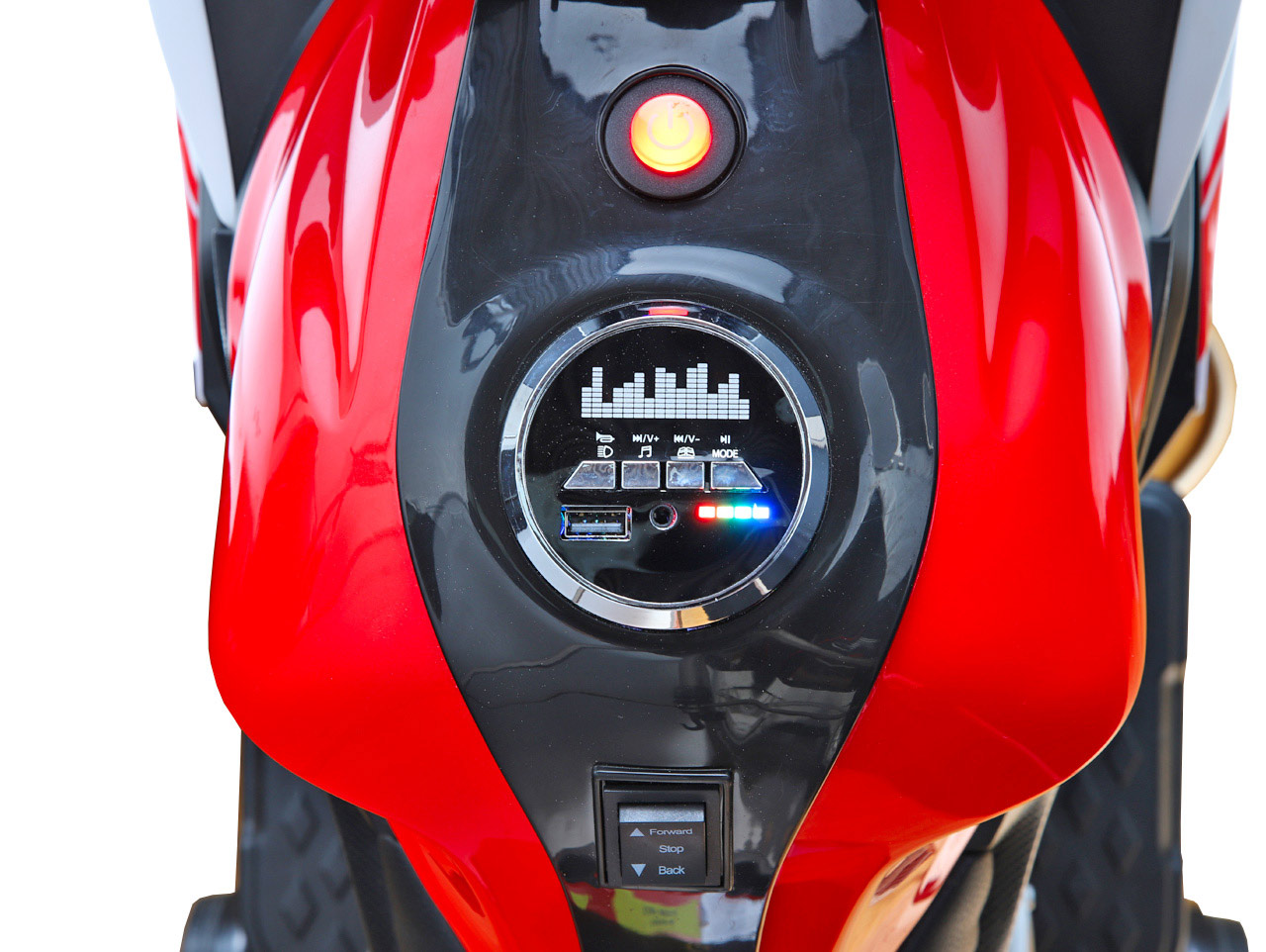 Počas jazdy si deti môžu zapnúť hudobný prehrávač. Ten síce obsahuje niekoľko vopred nahraných pesničiek, avšak tá pravá sranda samozrejme začína až za počúvania vlastnej muziky . Na to môžete použiť vstupy AUX a USB na nádrži. Pesničky stačí nahrať napríklad na flashku a tú zapojiť do motorky.