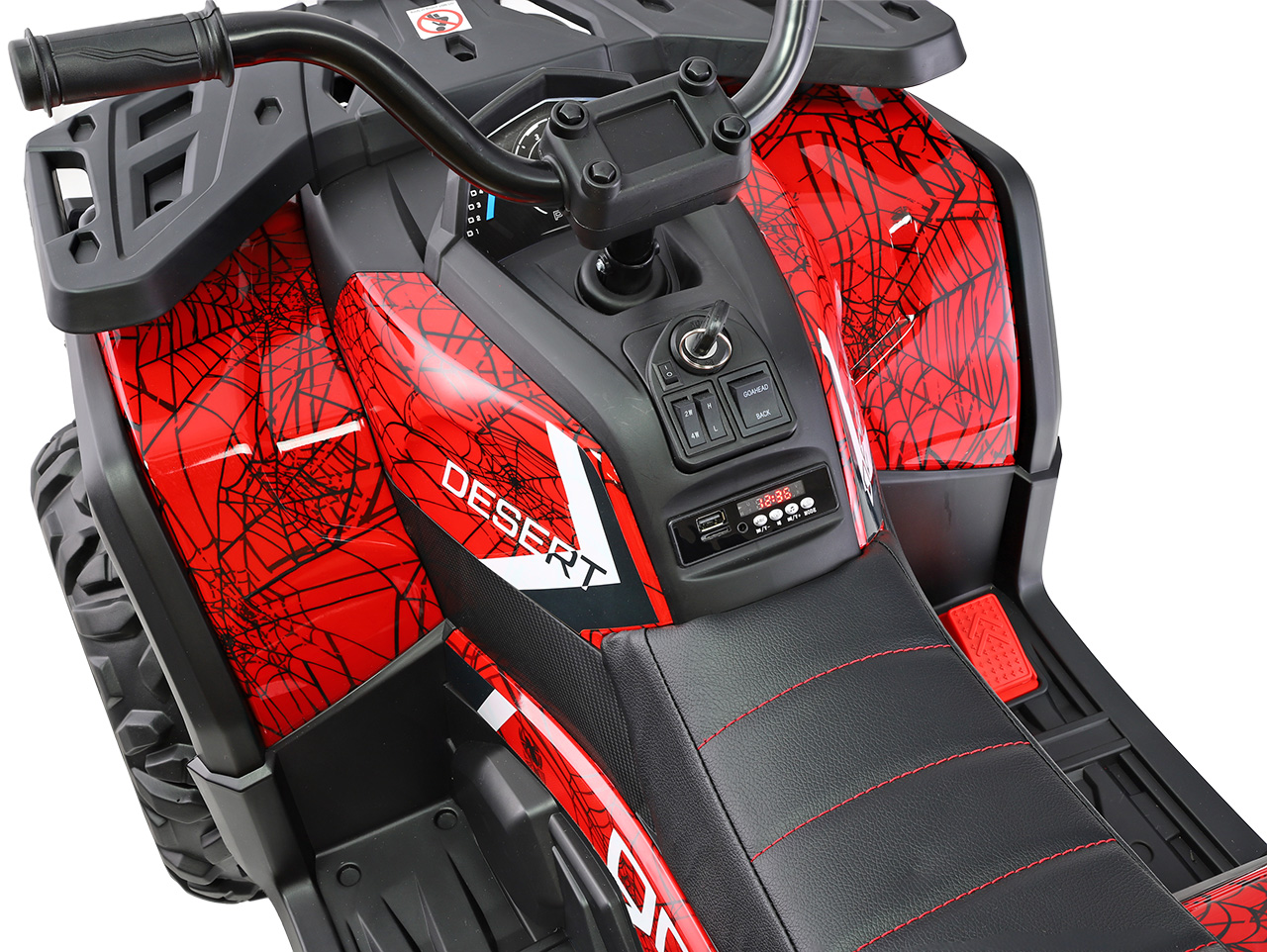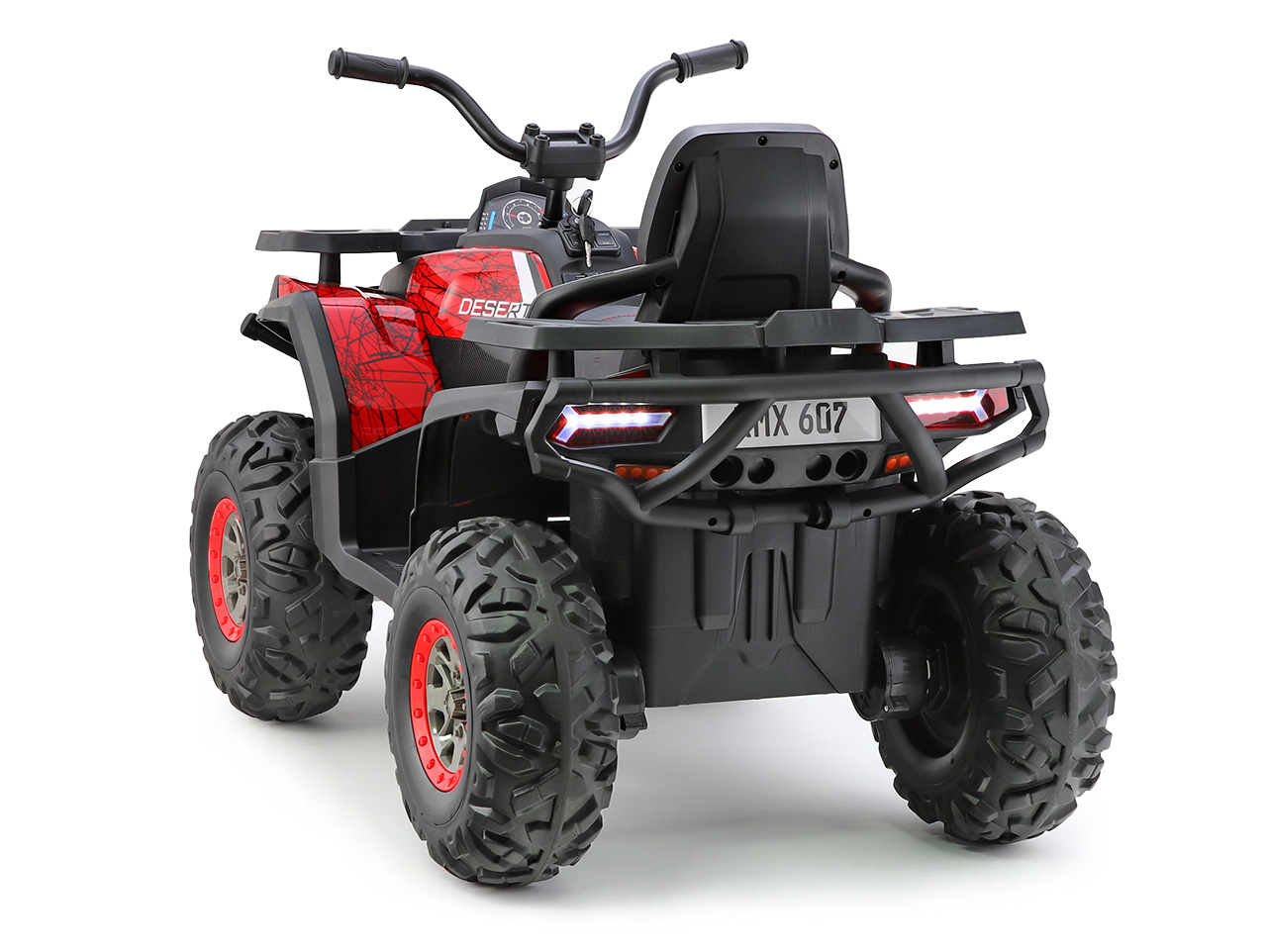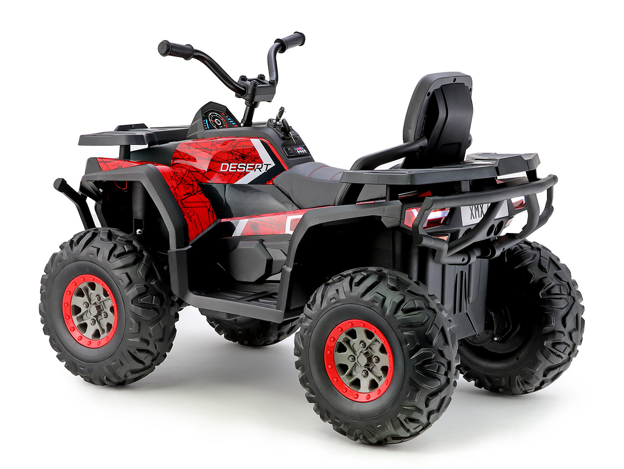 4 motory 12V/45W, 2 batérie 12V/7Ah (14Ah), pohon všetkých kolies, 2.4G diaľkové ovládanie, 2 rýchlosti na manuál / 3 na diaľkové ovládanie, plynulé rozjazdy, AUX, USB, SD karta, predné a zadné LED svetlá, zvukové efekty, EVA kolesá, polstrovaná sedačka, odpruženie zadnej nápravy, ukazovateľ stavu batérie, štartovacie klíčky, nosnosť až 50 kg, povrchová úprava Celý popis