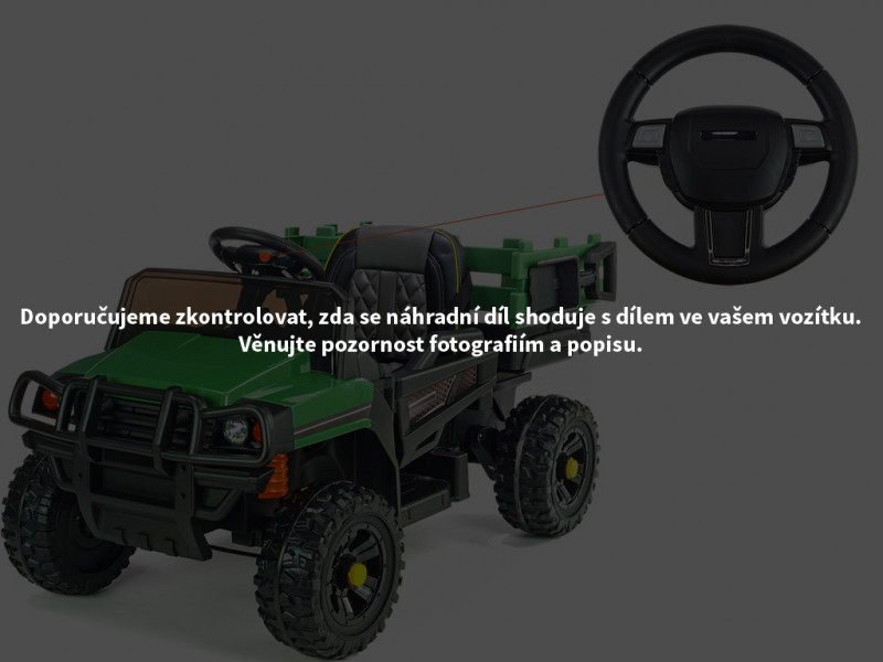 Volant určený pre detské elektrické autíčko Farm Trac BDM0926, priemer volantu 21 cm, je možné nasadiť na os s priemerom 12 mm. Pred objednaním náhradného dielu venujte pozornosť fotografiám a popisu. Aj keď máte rovnaké vozidlo, jednotlivé diely sa môžu líšiť. Odporúčame preto pozorne skontrolovať, či sa náhradný diel zhoduje s dielom vo vašom vozidle. Celý popis