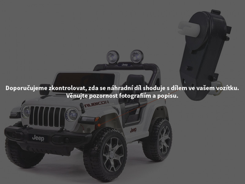Náhradný elektrický motor s prevodovkou je určený pre detské elektrické autíčko Jeep Wrangler Rubicon 4x4 a slúži na ovládanie volantu pomocou diaľkového ovládača. Motor s prevodovkou je možné nasadiť na os s priemerom 10 mm.