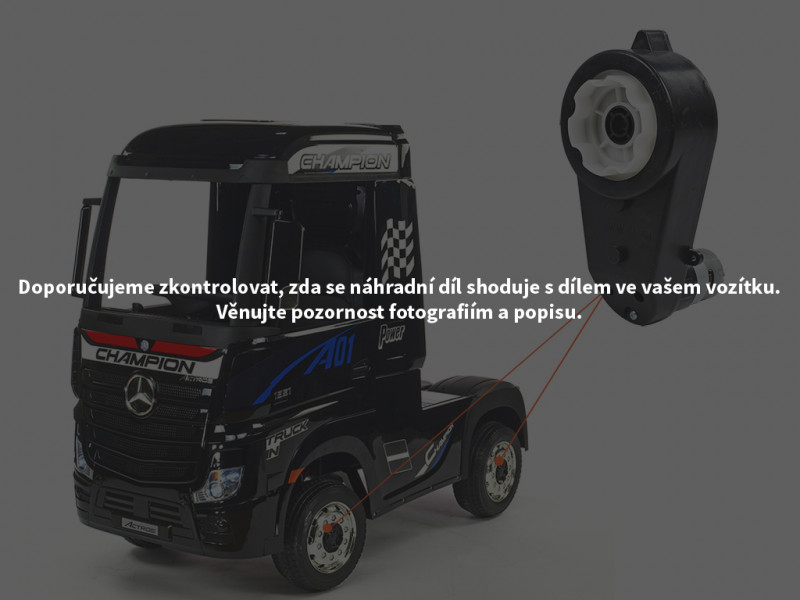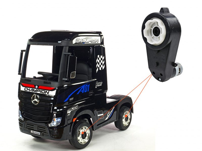 Náhradný elektrický motor s prevodovkou je určený pre detské elektrické autíčko ťahač Mercedes-Benz Actros 4x4 a slúži na pohon kolies. Motor s prevodovkou je možné nasadiť na os s priemerom 12 mm.