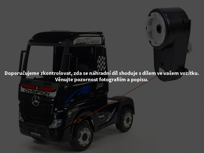 Určený pre detské elektrické autíčko Mercedes-Benz Actros 4x4, dĺžka 140 mm, šírka 80 mm, os priemer 10 mm, 12V. Slúži na ovládanie volantu pomocou diaľkového ovládača. Pred objednaním náhradného dielu venujte pozornosť fotografiám a popisu. Aj keď máte rovnaké vozidlo, jednotlivé diely sa môžu líšiť. Odporúčame preto pozorne skontrolovať, či sa náhradný diel zhoduje s dielom vo vašom vozidle. Celý popis