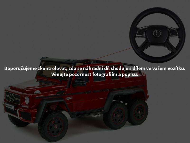 Volant určený pre detské elektrické autíčko Mercedes-Benz G63 šesťkolesový, priemer volantu 20 cm, je možné nasadiť na os s priemerom 12 mm. Pred objednaním náhradného dielu venujte pozornosť fotografiám a popisu. Aj keď máte rovnaké vozidlo, jednotlivé diely sa môžu líšiť. Odporúčame preto pozorne skontrolovať, či sa náhradný diel zhoduje s dielom vo vašom vozidle. Celý popis