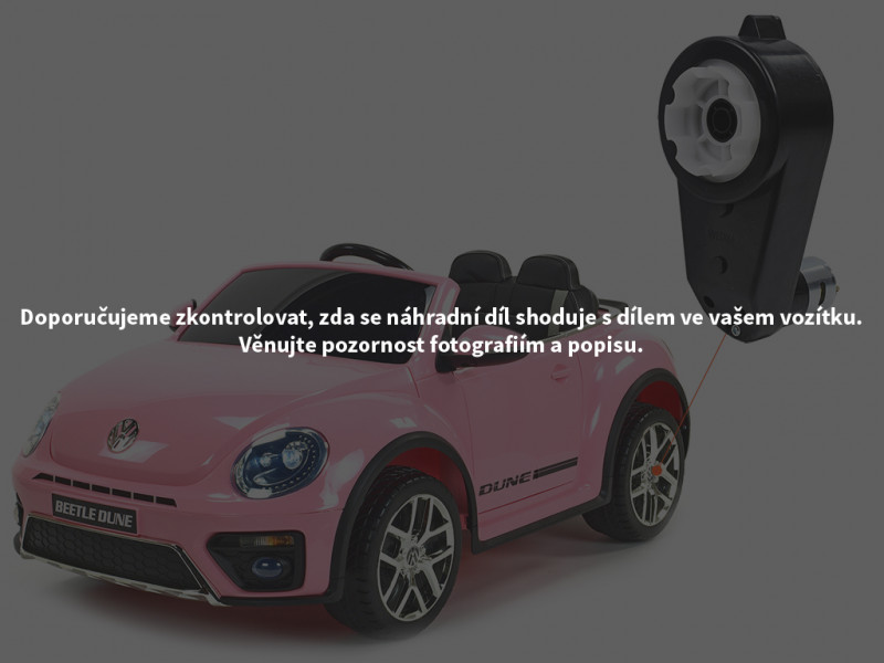 Náhradný elektrický motor s prevodovkou je určený pre detské elektrické autíčko Volkswagen Beetle Dune a slúži na pohon kolies. Motor s prevodovkou je možné nasadiť na os s priemerom 12 mm.