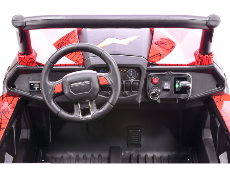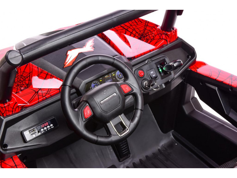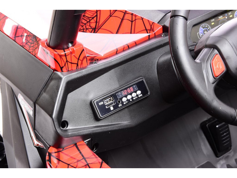 Púšťajte deťom ich obľúbenú muziku priamo z reproduktorov! Na palubnej doske buginy je zabudovaný hudobný prehrávač s USB, AUX (3,5 mm jack) a SD slotom. Stačí si teda len vybrať, ktorý variant je pre vás najpohodlnejší. Pesničky je možné napríklad nahrať na patričné USB zariadenie a to následne pripojiť k autíčku. Po spustení začne hudba znieť v reproduktoroch vozidla. Všetky zvuky je možné regulovať pomocou tlačidiel na palubke.