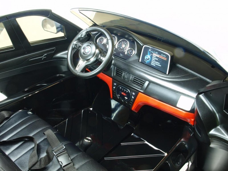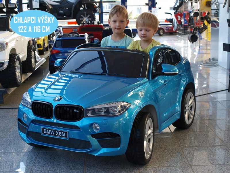 Jazdu v detailne prepracovanom zmenšenom modeli auta BMW X6 M si naplno užije každý malý vodič. Ide o jedno z najväčších detských vozítok v ponuke. Autíčko disponuje dvojmiestnou čalúnenou sedačkou, ktorá je opatrená dvoma nastaviteľnými bezpečnostnými pásmi. Deti si tak môžu zariadiť spoločne a zároveň budú plne v bezpečí. BMW X6 M predstavuje najmodernejší rad elektrických autíčok , novo vybavených elektrickou bzrdou. Konštrukcia a ovládanie vozítka boli uspôsobené tak, aby si riadenie ľahko a rýchlo osvojili aj tí najmenší. Stačí iba nasadnúť, zapnúť pás a zošliapnuť nožný pedál. Autíčko sa potom plynule a bez trhnutia rozbehne, uvoľnením pedála potom samo zabrzdí. Dva elektrické motory (2x 120 W/12 V) poháňa obe zadné kolesá a ponúka možnosť voľby 3 rýchlostí vpred a 3 vzad. Vo výbave deti ďalej nájdu svietiace LED svetlá (predné aj zadné) a dva osvetlené palubné prístroje. Pre pohodlnejšiu jazdu sú všetky kolesá gumové, vyrobené z EVA materiálu. Dvere s úložnými priestormi sú otvárateľné.