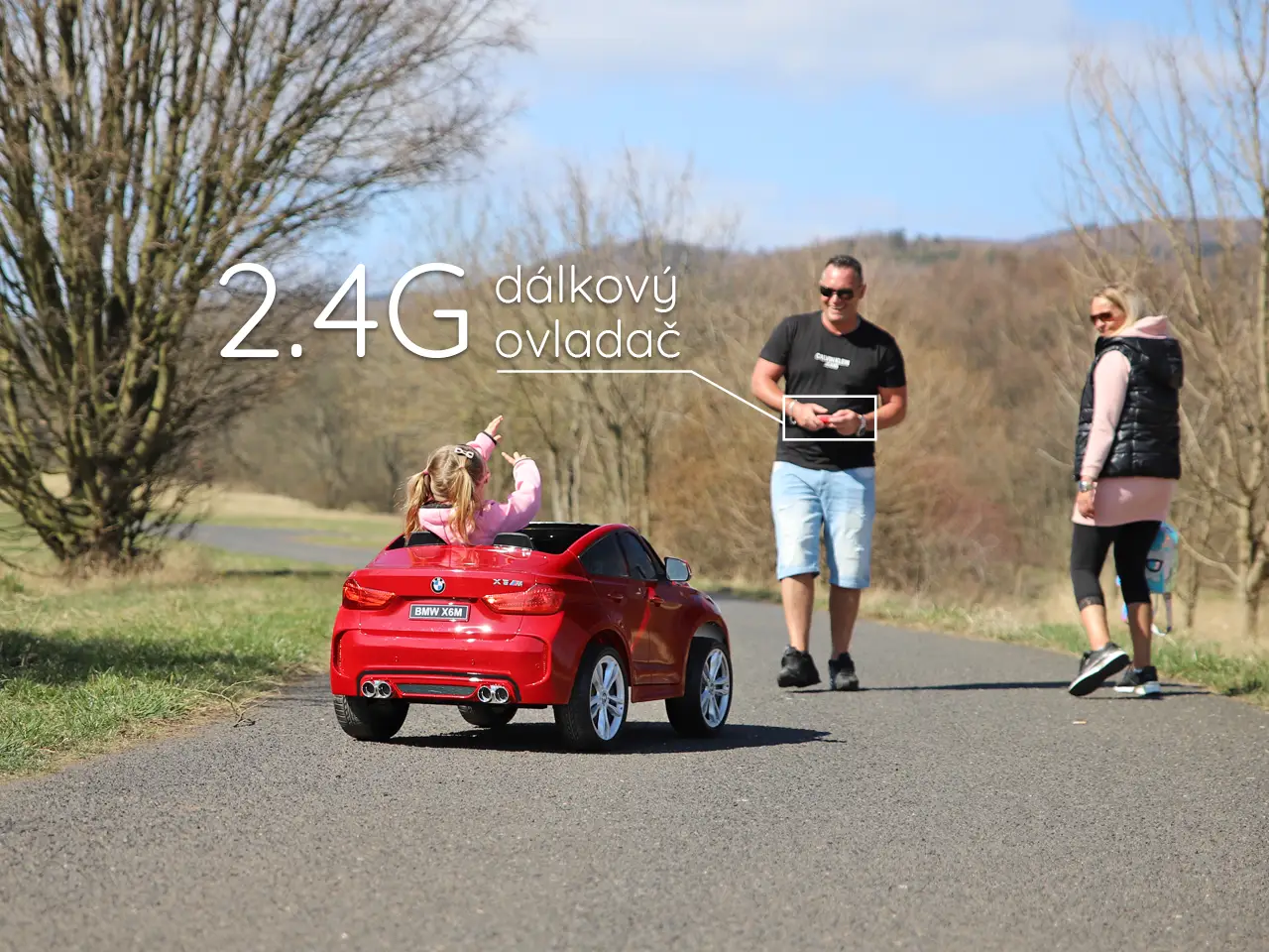 K BMW X6 M obdržíte 2.4G bluetooth diaľkový ovládač, ktorý má pred manuálnou jazdou na pedál prednosť. Nad vozidlom tak máte vždy plnú kontrolu a môžete ho kedykoľvek zastaviť aj napriek tomu, že by dieťa držalo nohu na pedáli. Ovládač príde vhod aj v prípade, keď si deti na samotné riadenie zatiaľ samé netrúfnu. Autíčko potom môžete bez problémov ovládať na diaľku a deti tak môžu riadeniu prísť postupne na chuť.