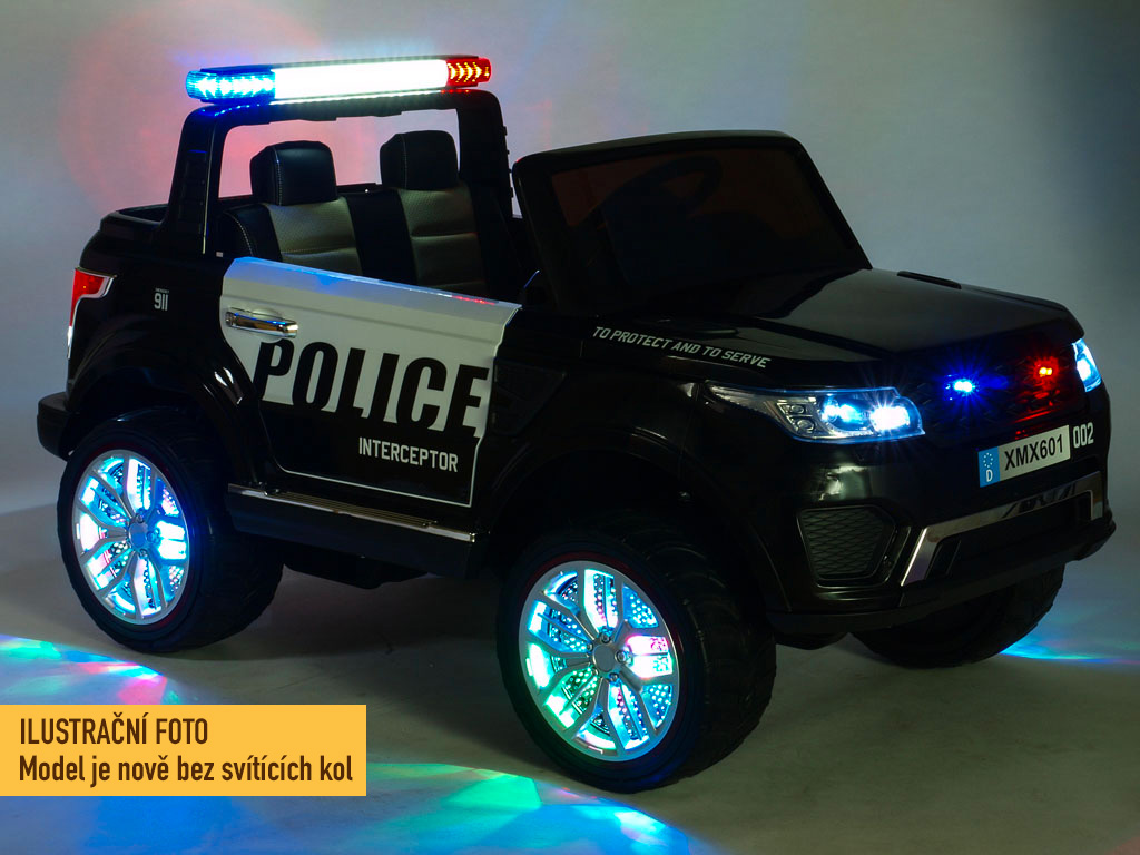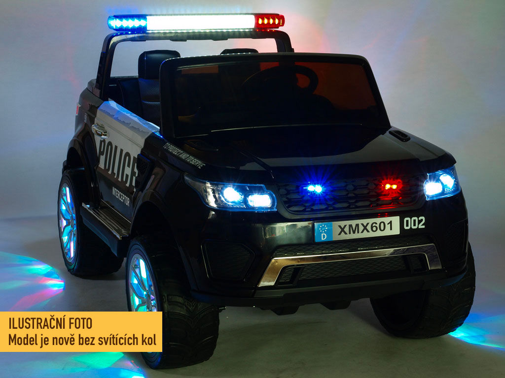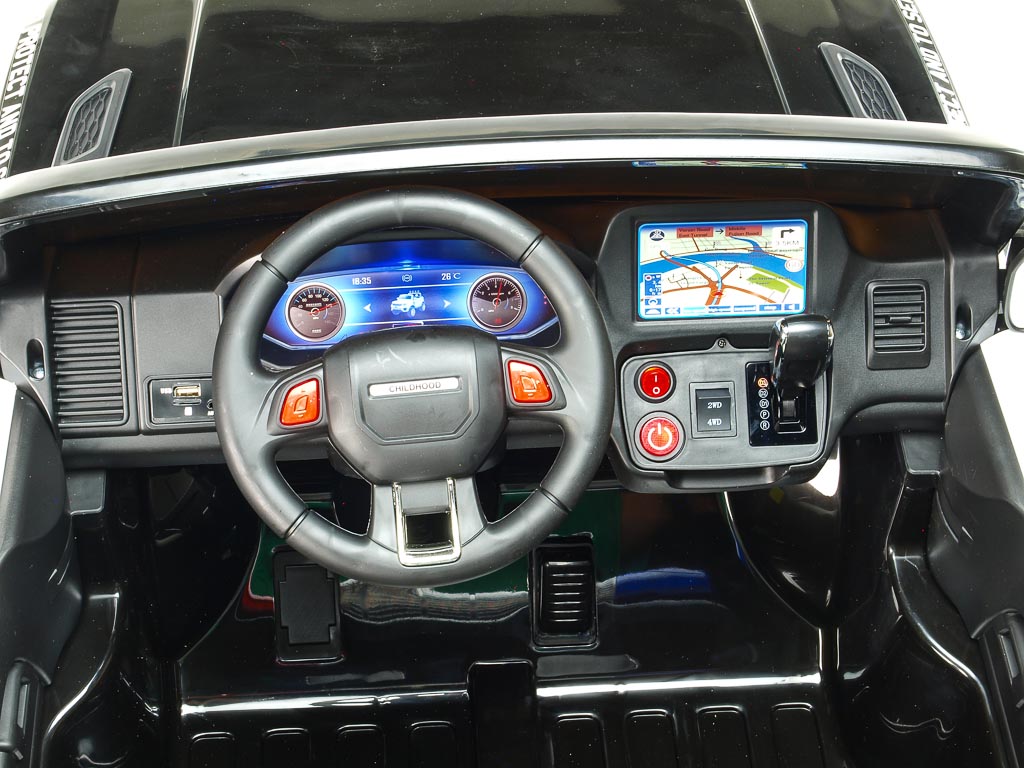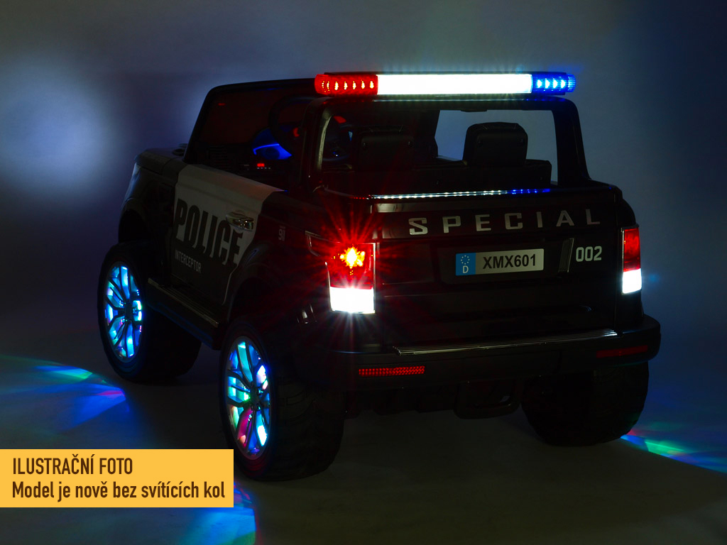 4 motory 12V/45W, batéria 12V/10Ah, pohon všetkých kolies, prepínač pohonu 2x2 a 4x4, 2.4G diaľkový ovládač s funkciou plnej kontroly, EVA kolesá, 2 rýchlosti na manuál, 3 rýchlosti na diaľkové ovládacie, policajné LED osvetlenie, zvukové efekty , klaksón, siréna, AUX/USB/SD, odpružená zadná náprava, otvárateľné dvere, ukazovateľ stavu batérie, zadný úložný priestor, polstrovaná sedačka, madlo na ... Celý popis