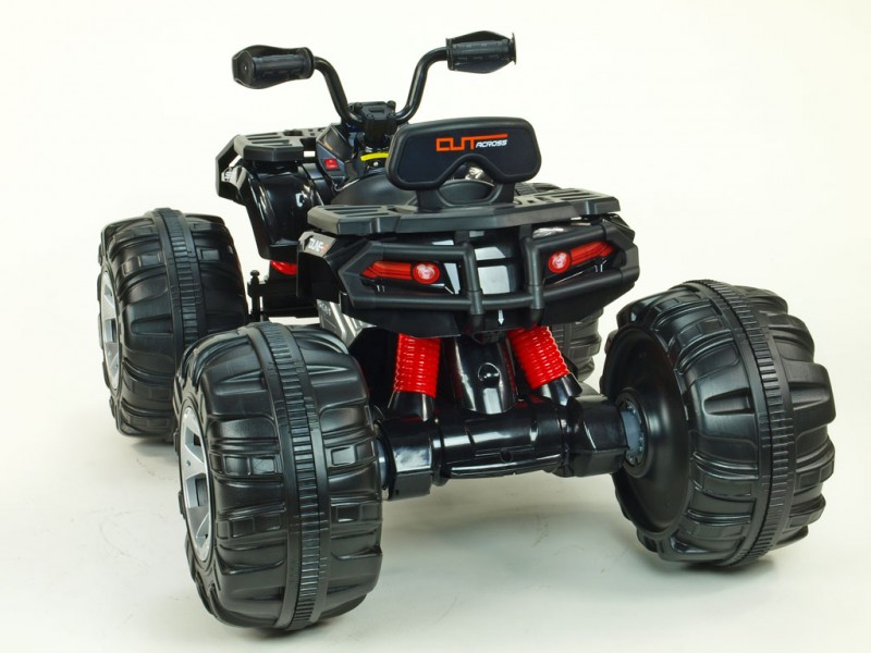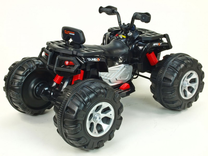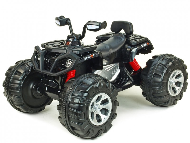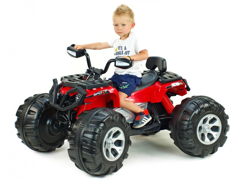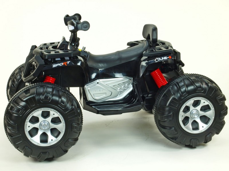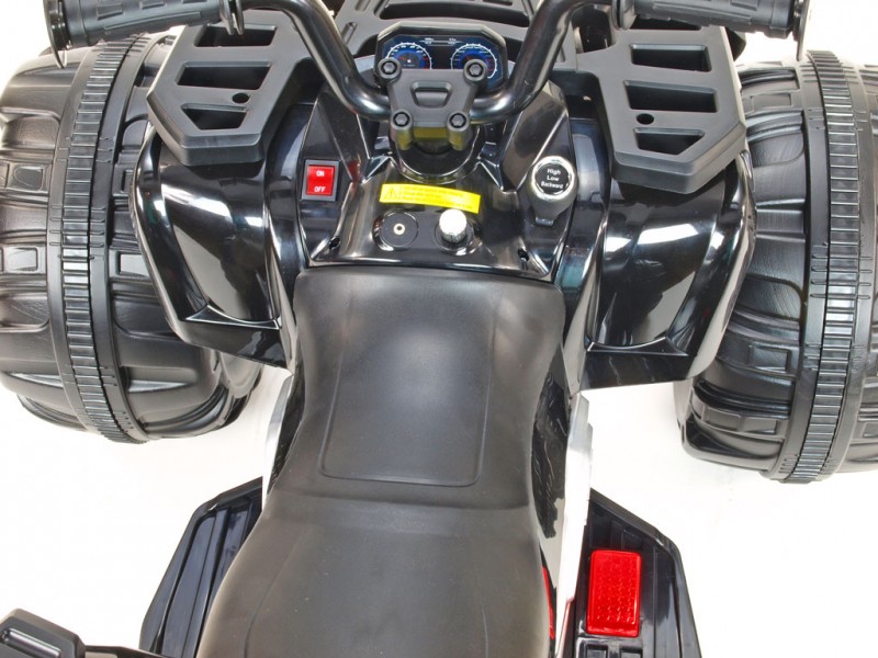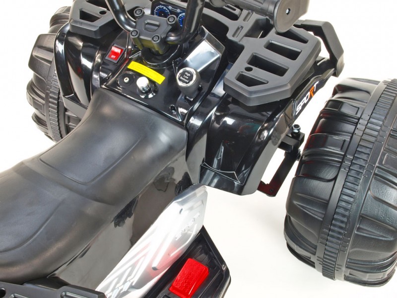 Exkluzívna terénna štvorkolka s prepracovaným realistickým dizajnom a kvalitnou konštrukciou. Masívne kolesá, dva silné elektrické motory (2x 45W / 24V) a náhon oboch zadných kolies umožňujú malým pretekárom vyčíňať bez problémov aj na nerovnom či trávnatom povrchu. S jazdou si ľahko poradia aj tí najmenší - stlačením nožného pedála sa vozítko rozbehne, uvoľnením pedála samo zabrzdí. Jazda na dva rýchlostné stupne vpred (možnosť prepínania pomalej/rýchlej jazdy) a jeden vzad, doprava, doľava. Nesmú chýbať ani zvukové efekty - pri zapnutí štvorkolky sa spustia zvuky štartovania a burácania motora. Pod riadidlami navyše nájdete vstup pre MP3 prehrávač, vďaka čomu je možné deťom počas jazdy pustiť ich obľúbenú muziku . Všetky zvuky je možné regulovať otočným ovládaním hlasitosti. Pre príjemnejšiu a tichšiu jazdu sú všetky kolesá vybavené gumovými pásmi. Riadidlá majú primontované chrániče rúk.