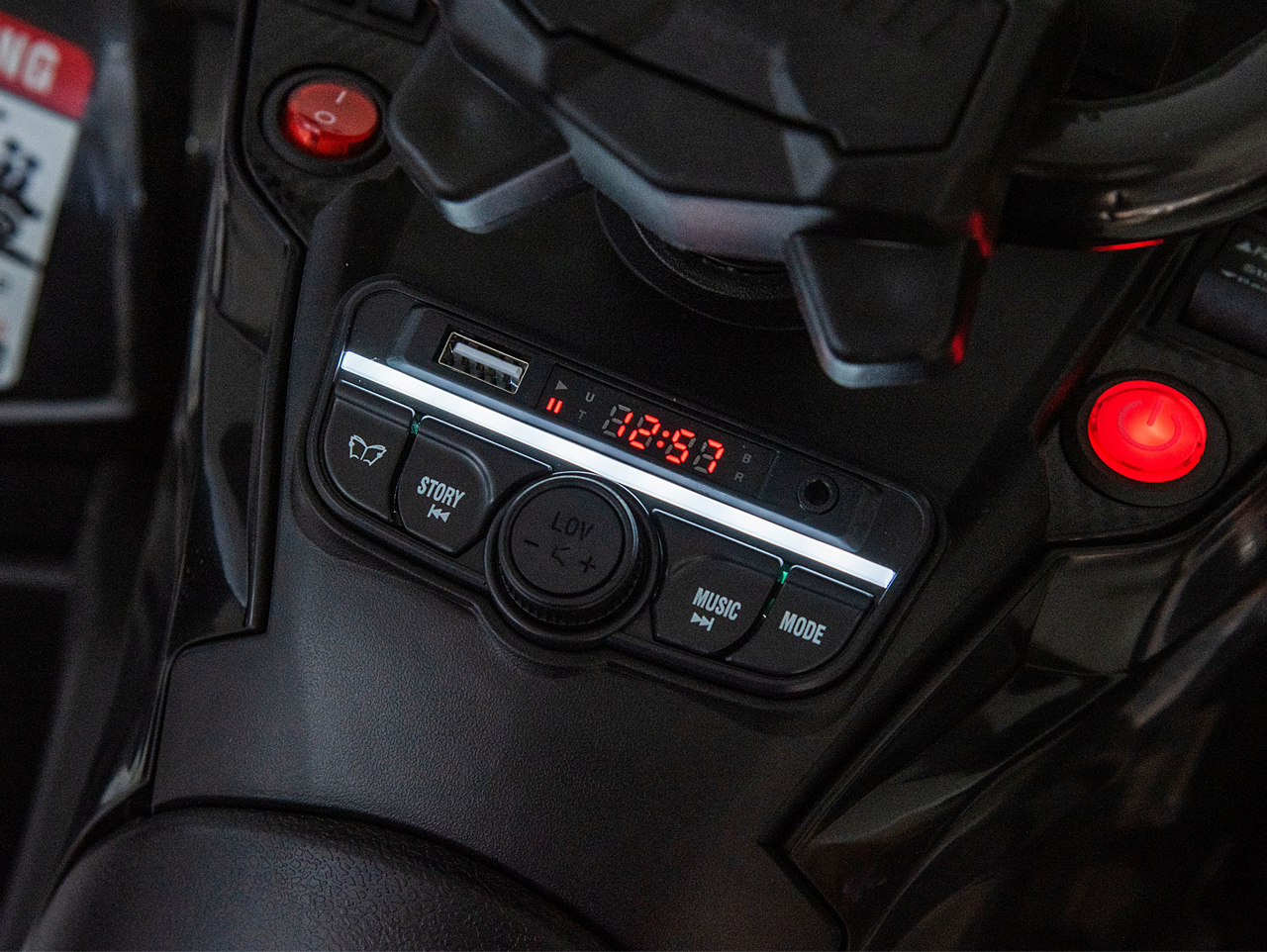 Čo by to bolo za terénne preteky bez muziky. Pri jazde na elektrickej štvorkolke Outlander si malý pretekár môže púšťať vlastné pesničky pomocou Bluetooth alebo AUX pripojenia z mobilu. Pokiaľ radšej mobil využijete sami pri tej vzácnej chvíli pokoja na lavičke, pichnite do USB slotu na palubke flash disk a muziku si bude dieťa púšťať z neho. A keď náhodou nemáte po ruke nič, vždy môžete naladiť FM rádio. Nebojte, poľovník na vás nepríde, že mu plašíte srny, hlasitosť hudby sa dá ľahko regulovať.